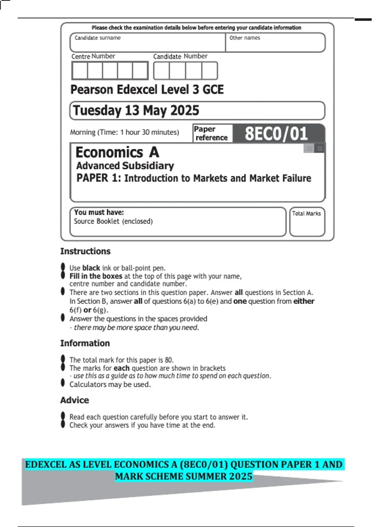 EDEXCEL AS LEVEL ECONOMICS A (8EC0/01) QUESTION PAPER 1 AND MARK SCHEME SUMMER 2025