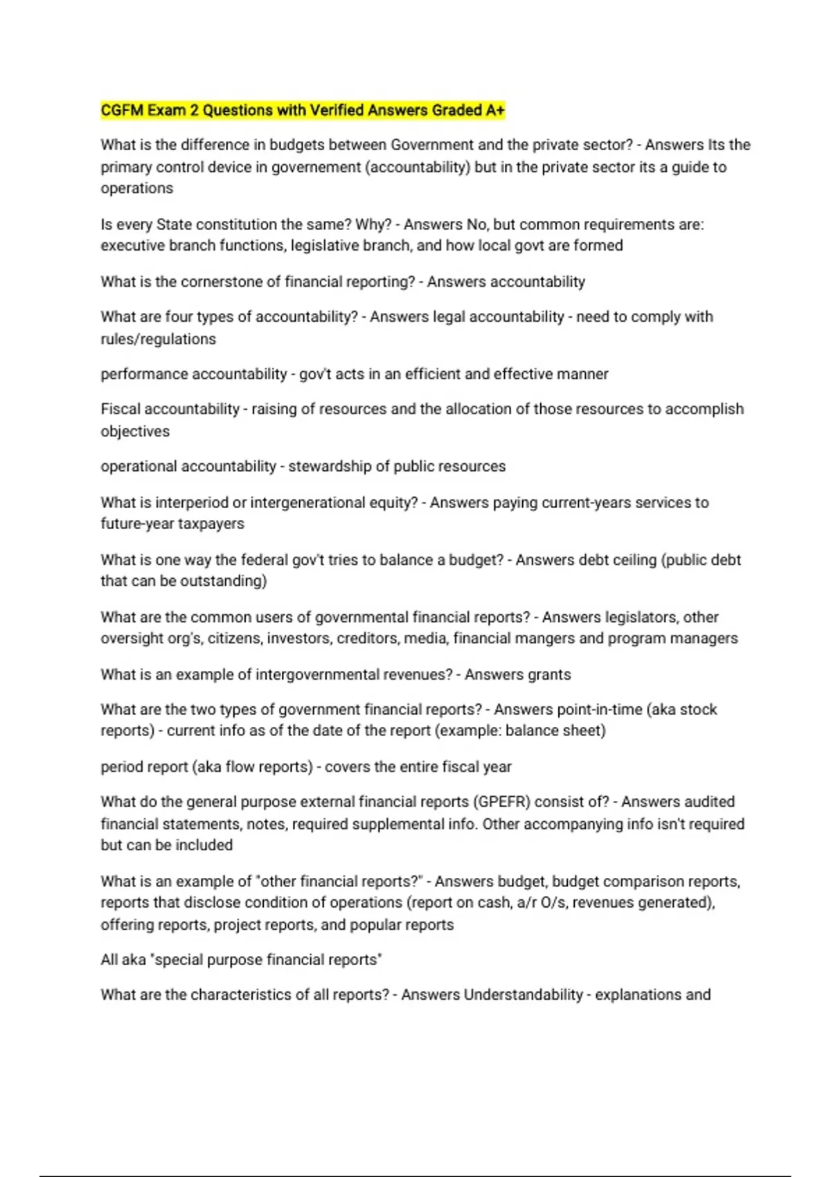 CGFM Exam 2 Questions with Verified Answers Graded A+ What is the difference in budgets between Government and the private sector? - Answers Its the primary control device in governement (accountability) but in the private sector its a guide to operations Is every State constitution the same? Why? - Answers No, but common requirements are: executive branch functions, legislative branch, and how local govt are formed What is the cornerstone of financial reporting? - Answers accountability What are four types of accountability? - Answers legal accountability - need to comply with rules/regulations performance accountability - gov't acts in an efficient and effective manner Fiscal accountability - raising of resources and the allocation of those resources to accomplish objectives operational accountability - stewardship of public resources What is interperiod or intergenerational equity? - Answers paying current-years services to future-year taxpayers What is one way the federal gov't tries to balance a budget? - Answers debt ceiling (public debt that can be outstanding) What are the common users of governmental financial reports? - Answers legislators, other oversight org's, citizens, investors, creditors, media, financial mangers and program managers What is an example of intergovernmental revenues? - Answers grants What are the two types of government financial reports? - Answers point-in-time (aka stock reports) - current info as of the date of the report (example: balance sheet) period report (aka flow reports) - covers the entire fiscal year What do the general purpose external financial reports (GPEFR) consist of? - Answers audited financial statements, notes, required supplemental info. Other accompanying info isn't required but can be included What is an example of "other financial reports?" - Answers budget, budget comparison reports, reports that disclose condition of operations (report on cash, a/r O/s, revenues generated), offering reports, project reports, and popular reports All aka "special purpose financial reports" What are the characteristics of all reports? - Answers Understandability - explanations and interpretations to help users understand Reliability - verifiable, free from bias Relevance - s/b capable of making a difference Timeliness - reported on a time frame Consistency - principles are used in current and future reports Comparability - like entities should report same info the same way Describe the steps it took to get to the reporting standards today. - Answers 1929 stock market crash due to companies inducing public on their "profitability." 1934 SEC was established to regulate securities. SEC granted authority to FASB for sta
