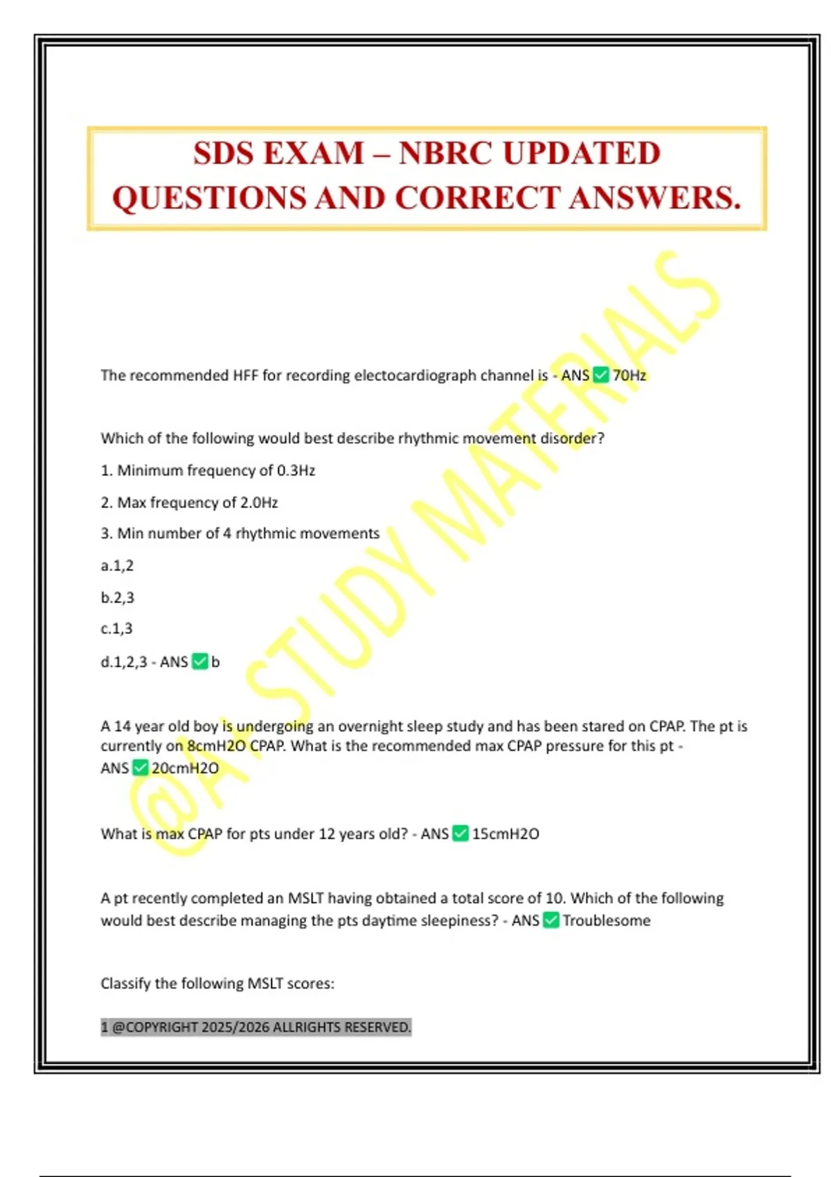 SDS EXAM – NBRC UPDATED QUESTIONS AND CORRECT ANSWERS.