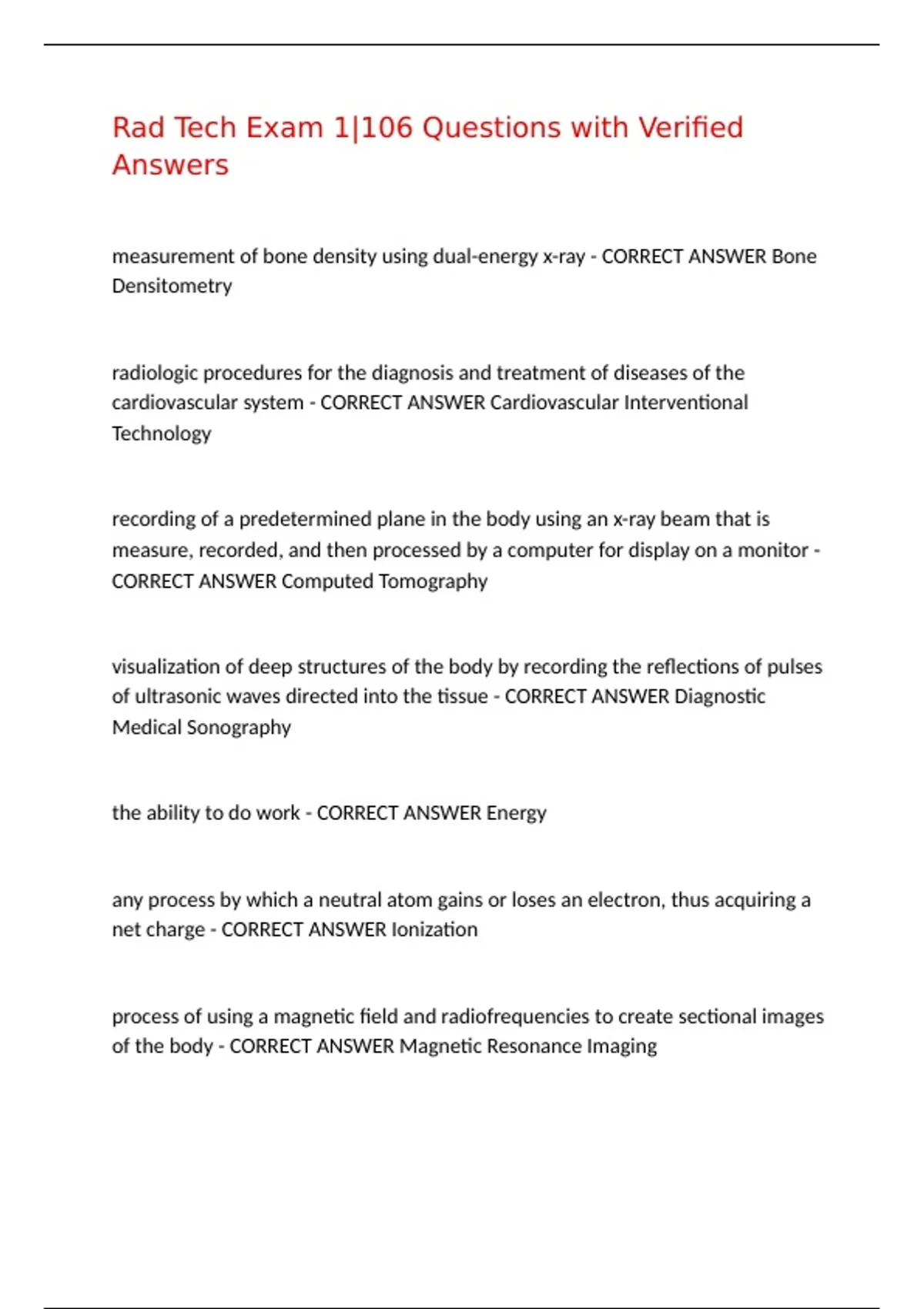 Rad Tech Exam 1|106 Questions with Verified Answers measurement of bone density using dual-energy x-ray - CORRECT ANSWER Bone Densitometry radiologic procedures for the diagnosis and treatment of diseases of the cardiovascular system - CORRECT ANSWER Cardiovascular Interventional Technology recording of a predetermined plane in the body using an x-ray beam that is measure, recorded, and then processed by a computer for display on a monitor - CORRECT ANSWER Computed Tomography visualization of deep structures of the body by recording the reflections of pulses of ultrasonic waves directed into the tissue - CORRECT ANSWER Diagnostic Medical Sonography the ability to do work - CORRECT ANSWER Energy any process by which a neutral atom gains or loses an electron, thus acquiring a net charge - CORRECT ANSWER Ionization