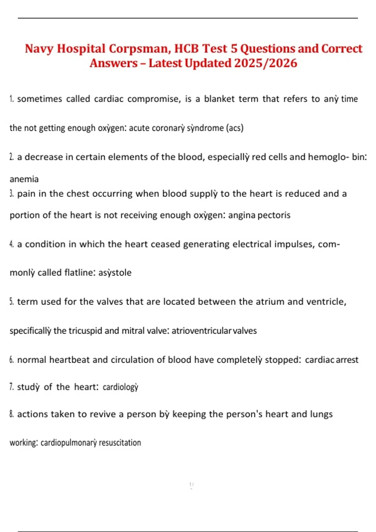 This document contains the full set of Test 5 questions and correct answers for the Navy Hospital Corpsman HCB curriculum. It reviews essential clinical knowledge, medical procedures, patient care protocols, and corpsman-specific responsibilities included in this module. The material reflects the latest updated content for the 2025/2026 cycle and is structured to support efficient study and exam readiness.