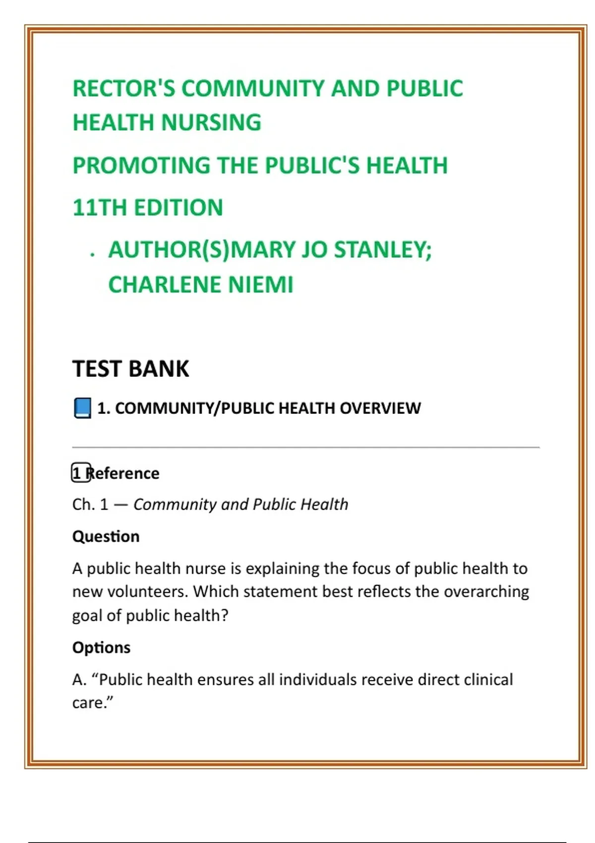 Rector Community & Public Health Nursing Test Bank 11th Ed | Stanley & Niemi | NCLEX-Style Population Health & Epidemiology MCQs (143 characters) 2) SEO Product Description (200–300 words) Master community and public health nursing with this comprehensive, exam-ready digital Test Bank for Rector’s Community and Public Health Nursing: Promoting the Public’s Health, 11th Edition (Stanley & Niemi). Designed for nursing students, NCLEX candidates, and educators seeking dependable evaluation material, this resource provides full-chapter coverage and 20 clinically accurate NCLEX-style questions per chapter—each written to reflect real-world epidemiology, population health, and community-focused practice. This powerful study tool strengthens public health assessment, epidemiological reasoning, levels of prevention, program planning, policy engagement, health promotion, and outbreak management. Every item includes a verified correct answer and evidence-based rationale, ensuring deep comprehension rather than memorization. Built for high performance and fast results, this digital test bank helps you: Build confidence in epidemiology, community assessment, and population-focused care Improve readiness for NCLEX population-health, health promotion, and prevention questions Reinforce complex community/public health concepts with scenario-based items Save hours of study time with organized, chapter-specific question sets Strengthen skills for clinical rotations, population-health modules, and community practice evaluations What’s Included Complete test bank covering ALL units & chapters (Rector, 11th Ed) 20 NCLEX-style MCQs per chapter Correct answers + evidence-based rationales Community/public health case studies spanning epidemiology, health promotion, prevention, policy, disaster response, and vulnerable populations Instant digital access — study anywhere, anytime Ideal for nursing students, public health learners, faculty, NCLEX prep, and anyone mastering Rector’s Community & Public Health Nursing. Position yourself for excellence in population health, epidemiology, and community-based nursing practice with the most complete Rector-aligned test bank available. 3) 8 High-Value SEO Keywords Community and public health nursing test bank Rector community health MCQs Stanley and Niemi test bank Population health NCLEX questions Epidemiology study guide nursing Public health nursing exam prep NCLEX-style community health questions Community assessment nursing review 4) 10 Optimized Hashtags #CommunityHealthNursing #PublicHealthNursing #PopulationHealth #EpidemiologyReview #NCLEXPrep #NursingTestBank #Rector11thEdition #StanleyNiemi #NursingSchoolSuccess #ClinicalPrevention