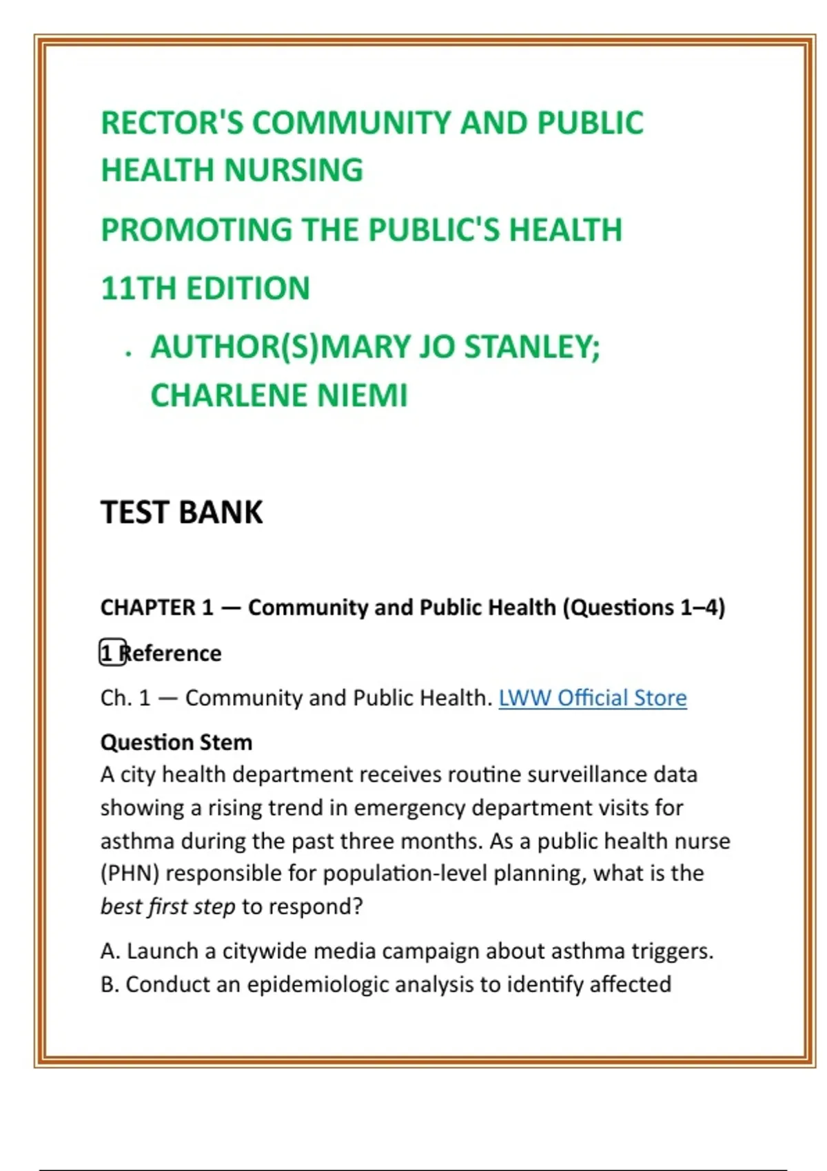 Community & Public Health Nursing Test Bank | Rector 11th Ed | Stanley & Niemi | NCLEX-Style Public Health MCQs & Epidemiology Review 2) SEO Product Description (200–300 words) Master the complexities of community and public health nursing with this comprehensive Rector’s Community and Public Health Nursing: Promoting the Public’s Health, 11th Edition Test Bank. Designed by expert item writers, this digital resource delivers the most accurate, exam-ready preparation for nursing students seeking mastery in population health, epidemiology, health promotion, and community-based clinical decision-making. This premium test bank includes full textbook coverage of all chapters and units, with 20 professionally written NCLEX-style multiple-choice questions per chapter. Every item is paired with a correct answer and evidence-based rationale, reinforcing key principles such as levels of prevention, health policy, outbreak investigation, community assessment, CHN competencies, program planning, and vulnerable-population care. Built for high performance, this test bank strengthens clinical reasoning, boosts exam confidence, and saves hours of study time. Students consistently report improved readiness for public health nursing exams, population health modules, epidemiology quizzes, capstone assessments, and NCLEX-RN population-health items. Ideal for nursing students, faculty, tutors, and reviewers needing a reliable, curriculum-aligned resource grounded in Rector’s authoritative public health nursing framework. Key Features Full coverage of Rector, Stanley & Niemi – 11th Edition 20 NCLEX-style MCQs per chapter Detailed rationales for every question Community/public health case-based scenarios Epidemiology, policy, program planning, and CHN practice competencies Instant digital access—study anywhere Perfect for NCLEX, HESI, ATI, nursing coursework, and population health rotations Designed for maximum retention and exam success Empower your mastery of community and public health nursing—from assessment to intervention to evaluation—with the most complete and trusted test bank available. 3) 8 High-Value SEO Keywords public health nursing test bank Rector community health MCQs community and public health NCLEX questions epidemiology study guide Stanley and Niemi test bank population health nursing review community assessment practice questions public health nursing exam prep 4) 10 Hashtags #PublicHealthNursing #CommunityHealthNursing #NCLEXPrep #NursingTestBank #PopulationHealth #EpidemiologyReview #Rector11thEdition #NursingSchoolSuccess #CHNExamPrep #NurseEducatorTools