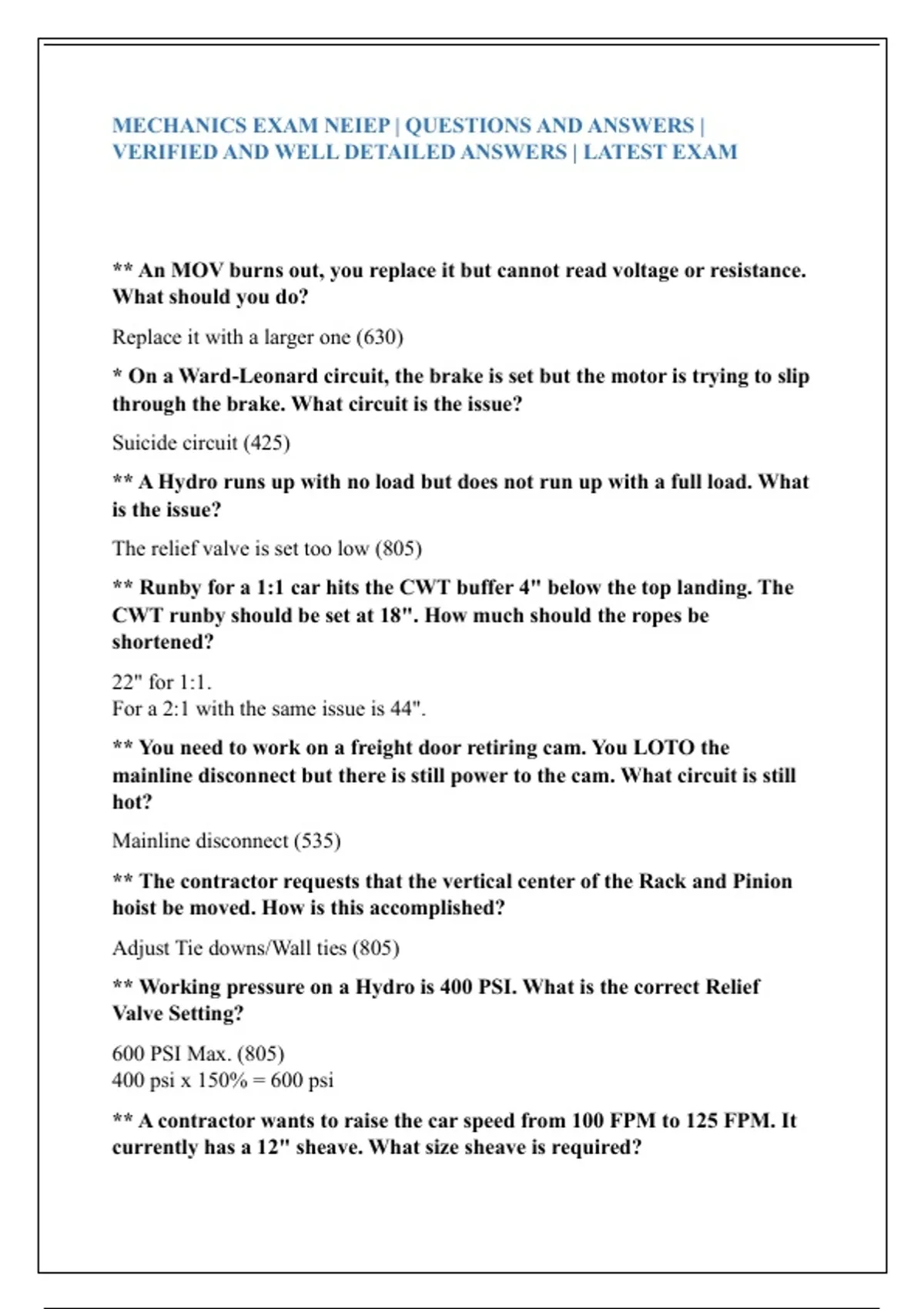 MECHANICS EXAM NEIEP | QUESTIONS AND ANSWERS |