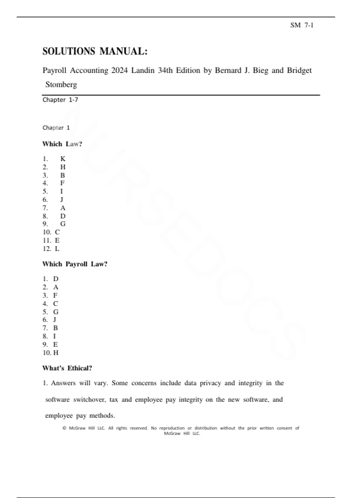 This document contains the full Solution Manual for Payroll Accounting 2024, 34th Edition by Bernard J. Bieg and Bridget Stomberg. It provides step-by-step solutions to all chapter exercises, including payroll calculations, federal and state tax withholdings, employer tax obligations, payroll systems, accounting entries, and compliance requirements. The solutions are structured to help students verify their work and reinforce understanding of current payroll laws and practices.