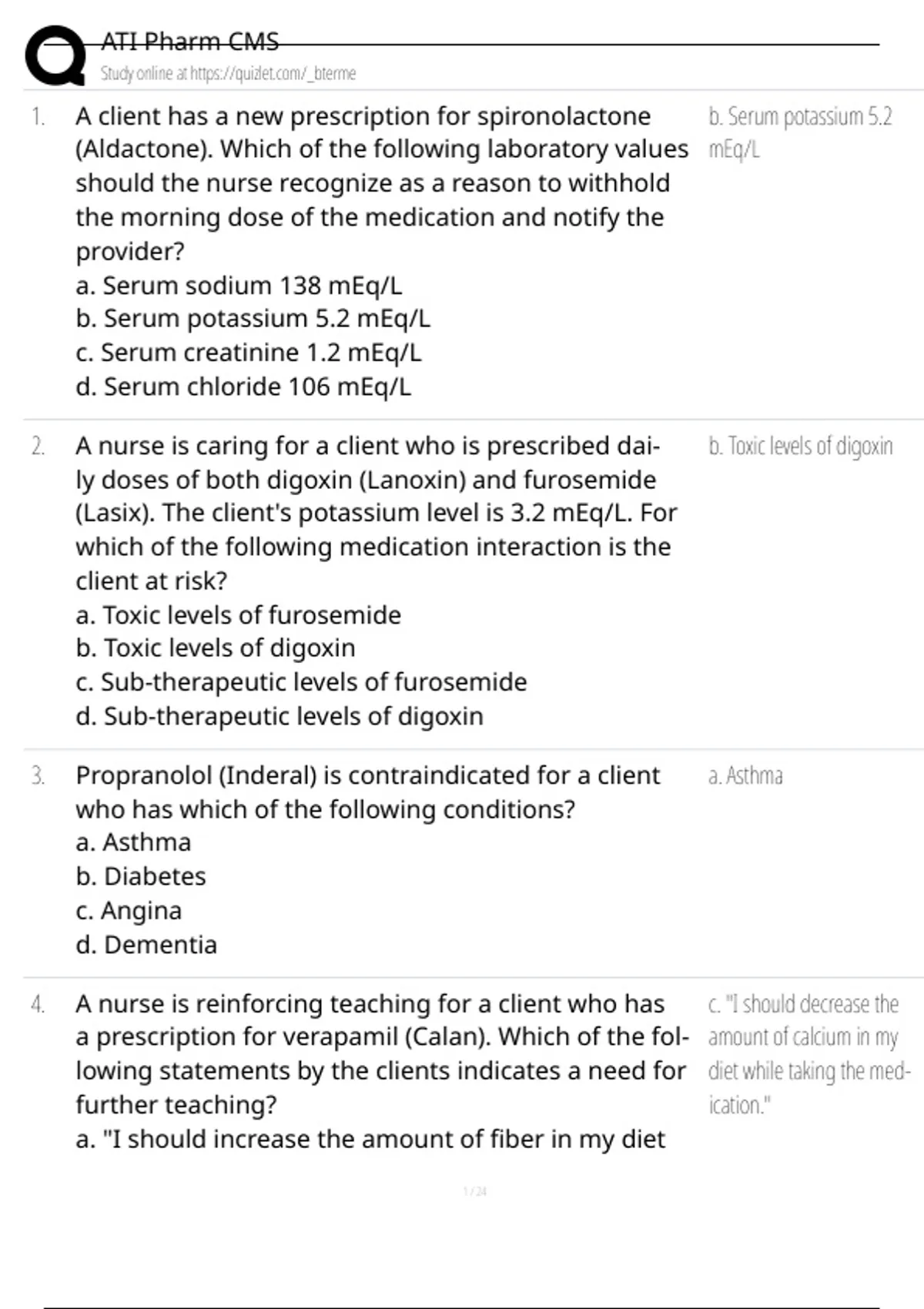 1. A client has a new prescription for spironolactone b. Serum potassium 5.2