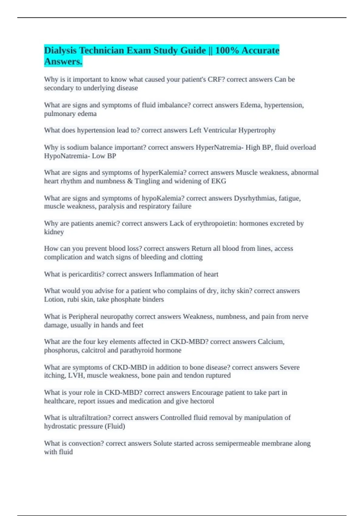 Dialysis Technician Exam Study Guide || 100% Accurate Answers.