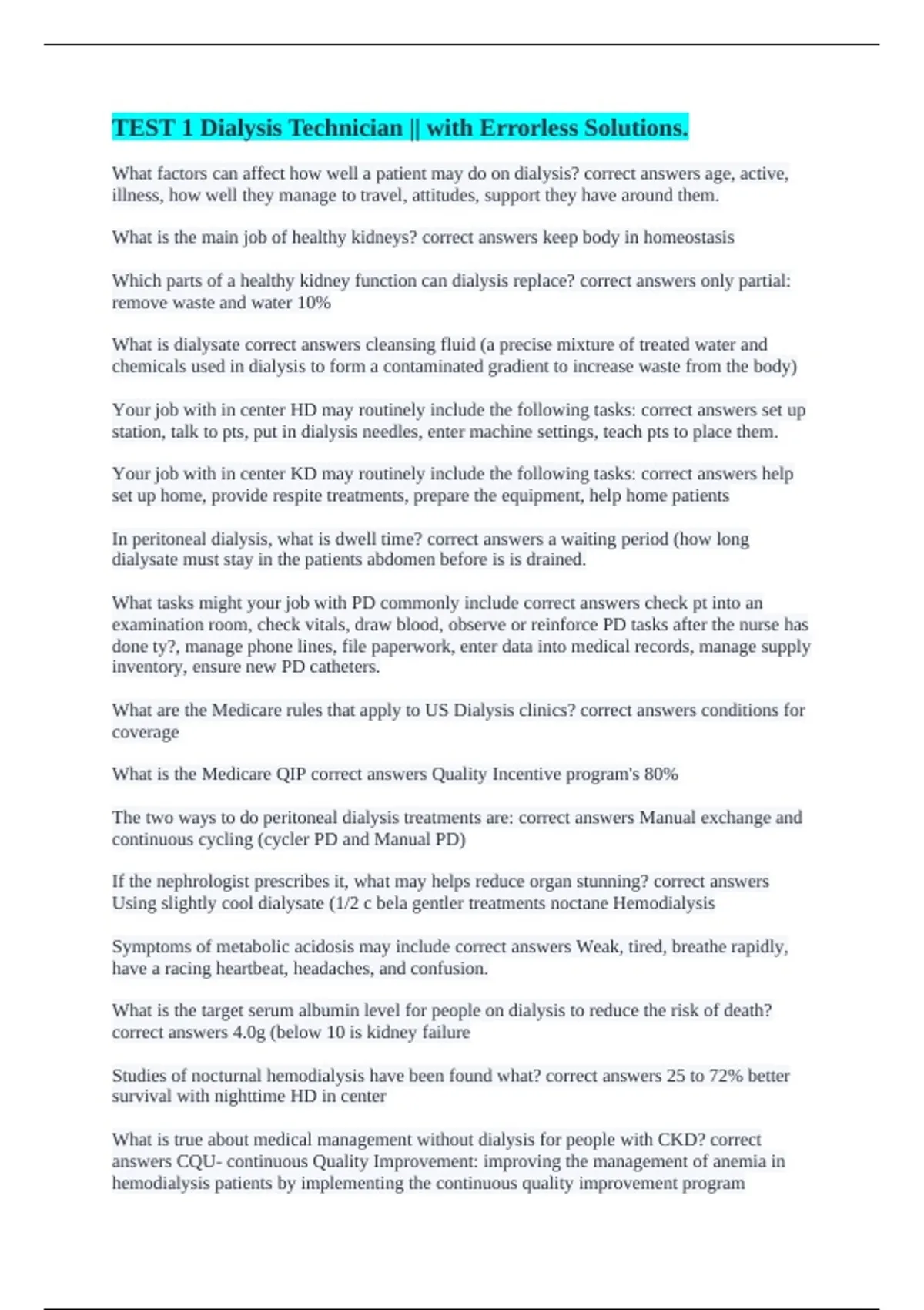 TEST 1 Dialysis Technician || with Errorless Solutions.