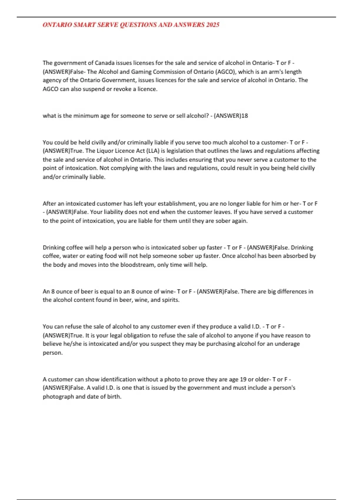 , ONTARIO SMART SERVE QUESTIONS AND ANSWERS 2025