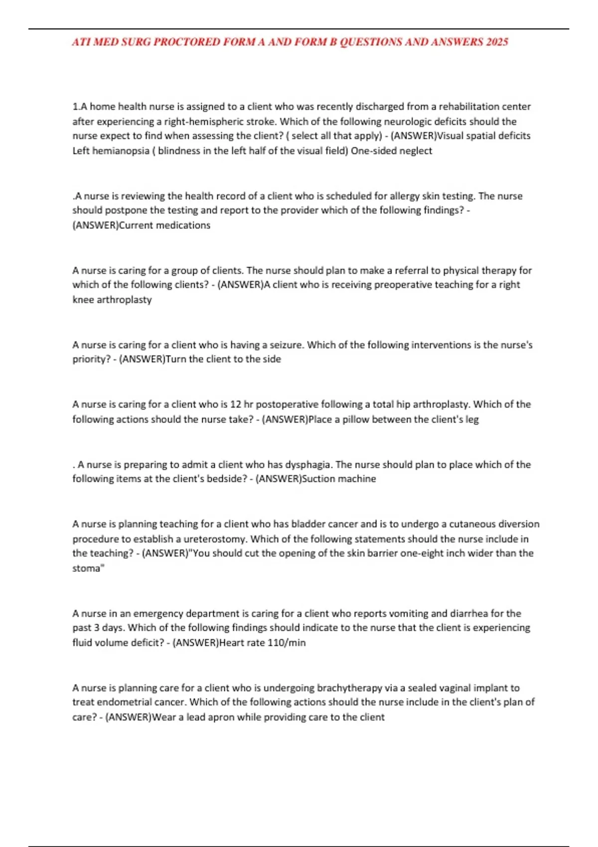 , ATI MED SURG PROCTORED FORM A AND FORM B QUESTIONS AND ANSWERS 2025