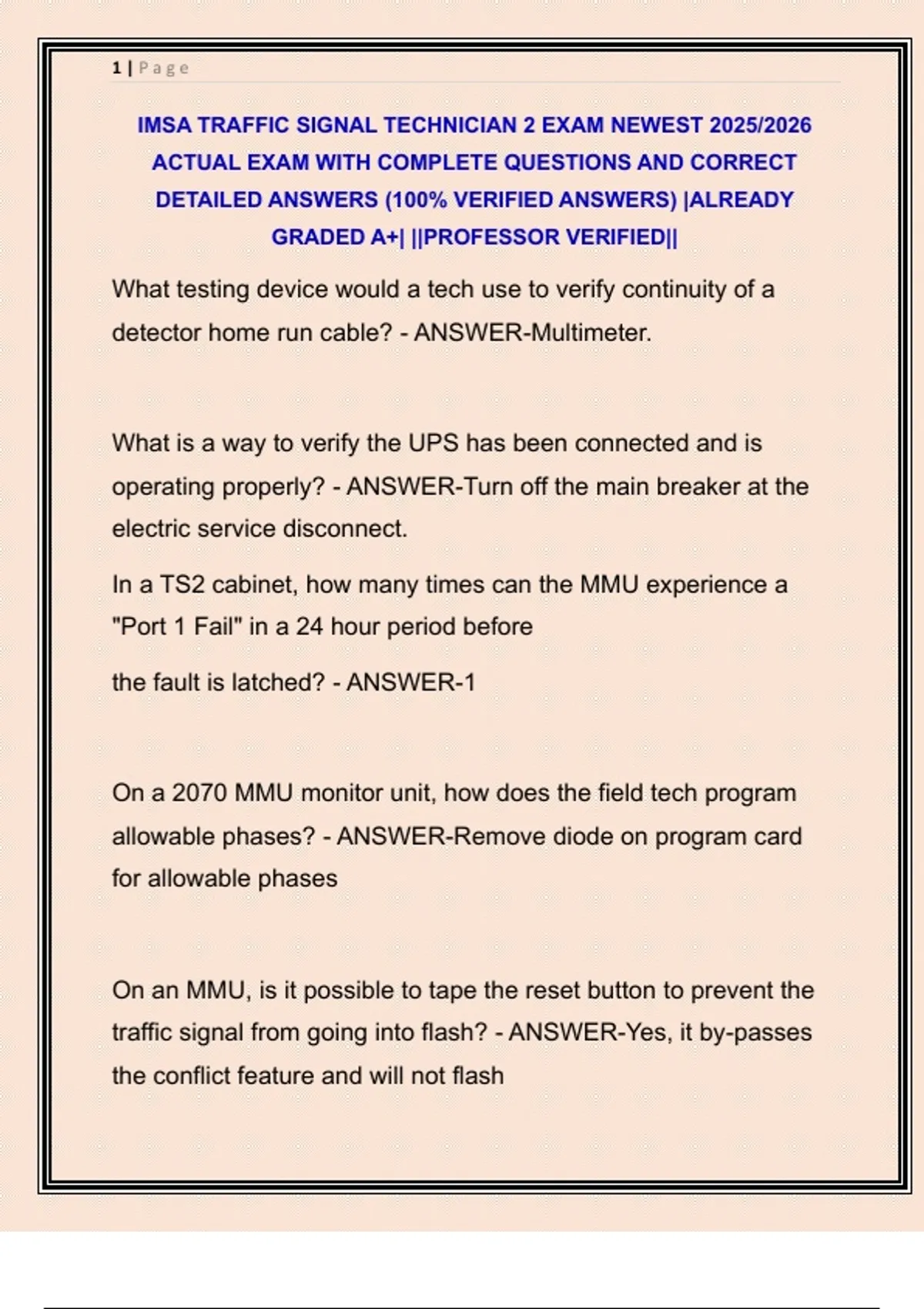 IMSA TRAFFIC SIGNAL TECHNICIAN 2 EXAM NEWEST 2025/2026 ACTUAL EXAM WITH COMPLETE QUESTIONS AND CORRECT DETAILED ANSWERS (100% VERIFIED ANSWERS) |ALREADY GRADED A+| ||PROFESSOR VERIFIED||