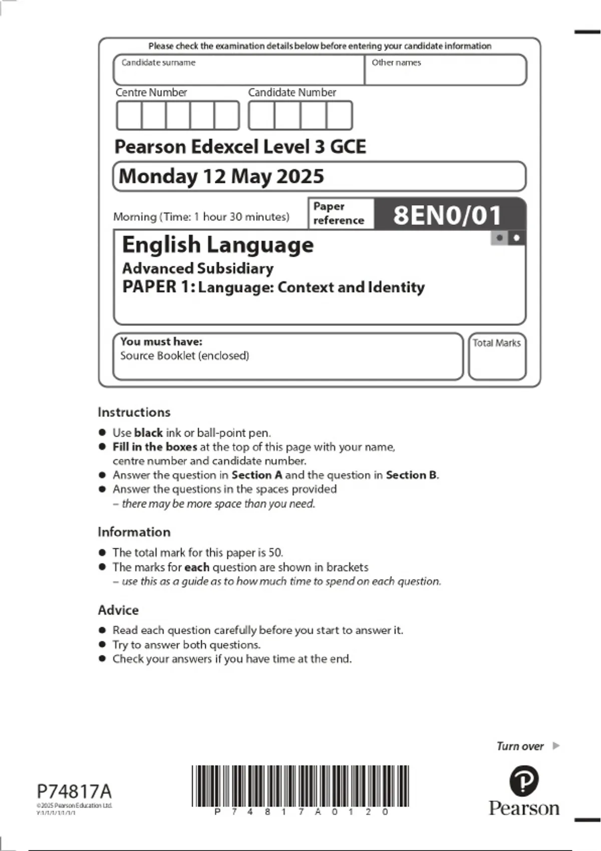 2025 Pearson Edexcel Level 3 GCE English Language Advanced Subsidiary PAPER 1: Language: Context and Identity Combined Question Paper and Marking Scheme