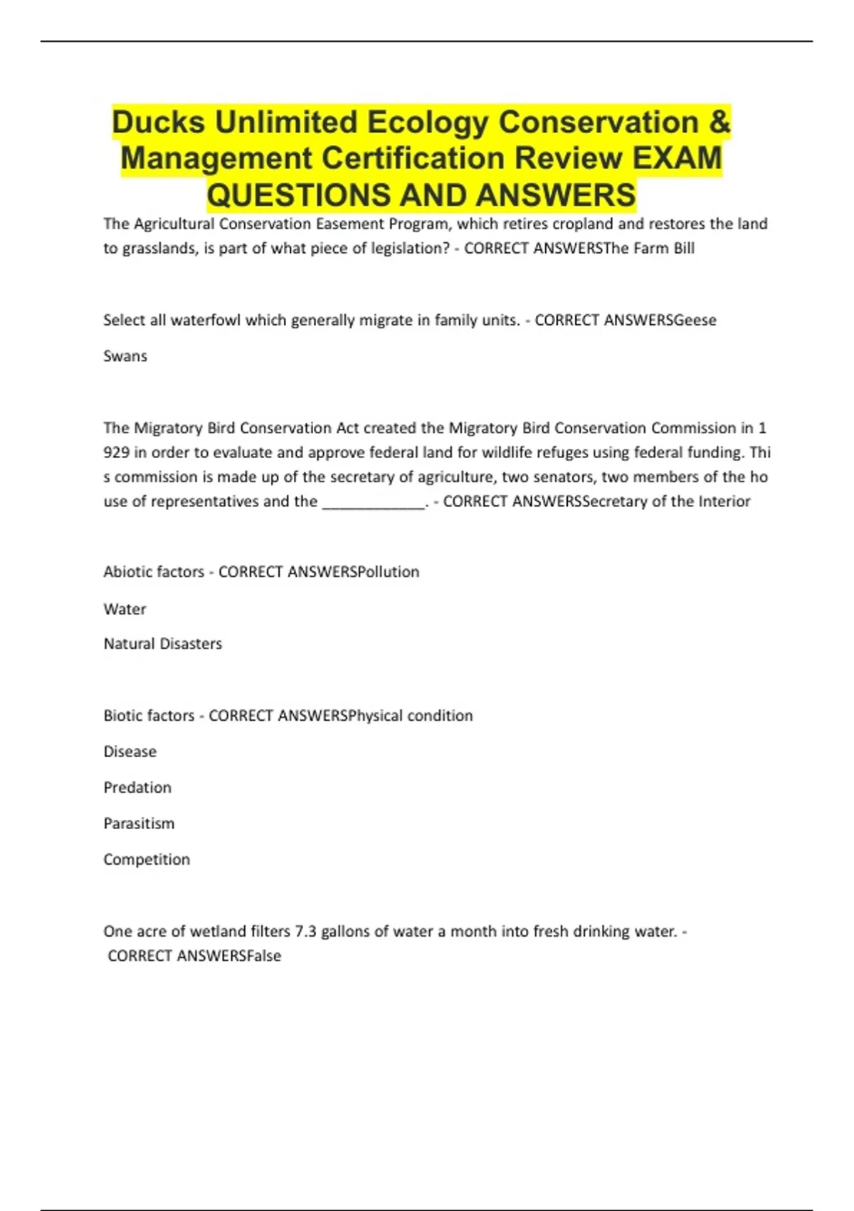 Ducks Unlimited Ecology Conservation & Management Certification Review EXAM QUESTIONS AND ANSWERS.pdf