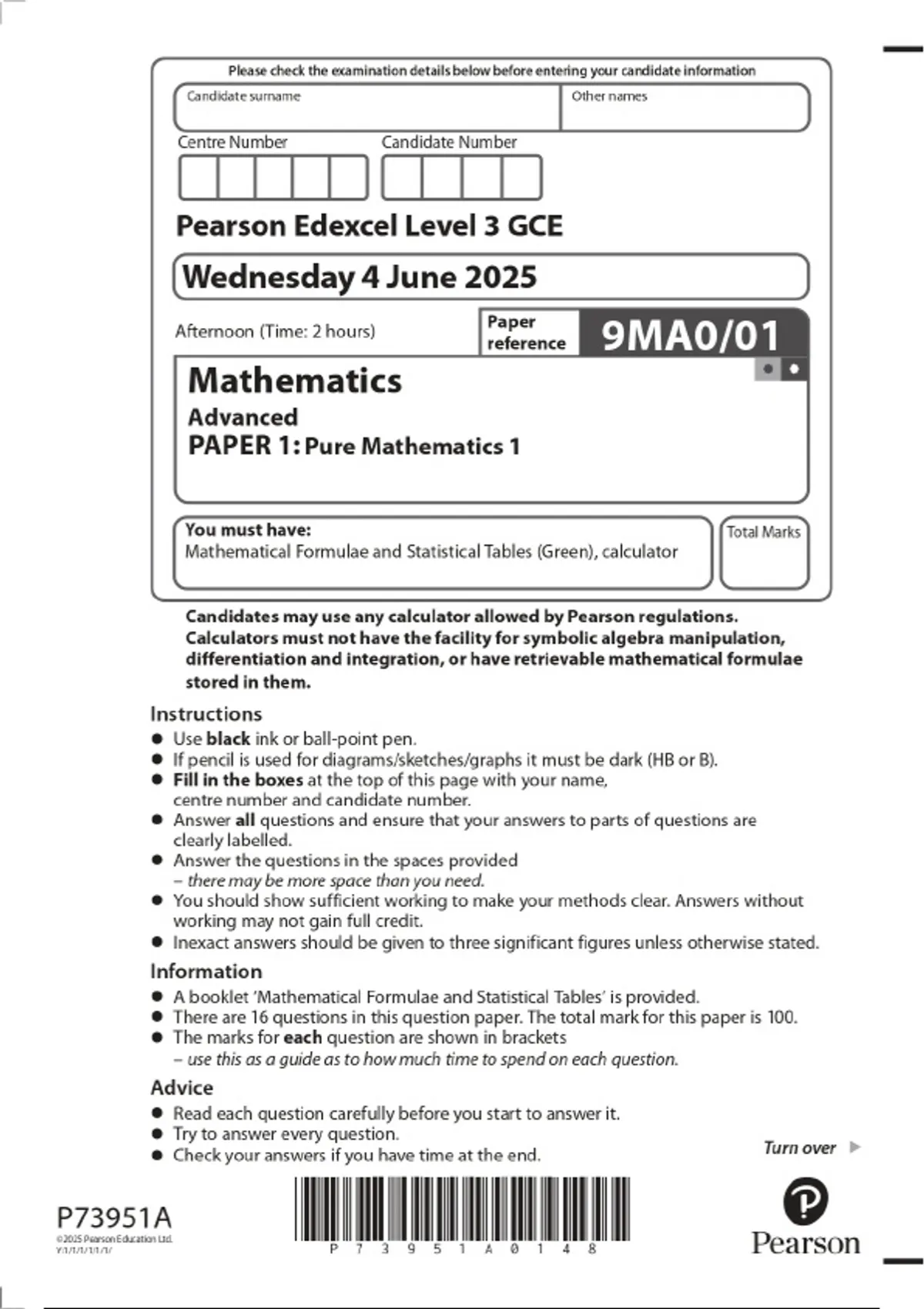 2025 Pearson Edexcel Level 3 GCE Further Mathematics Advanced PAPER 1: Pure Mathematics 1 Combined Question Paper and Marking Scheme