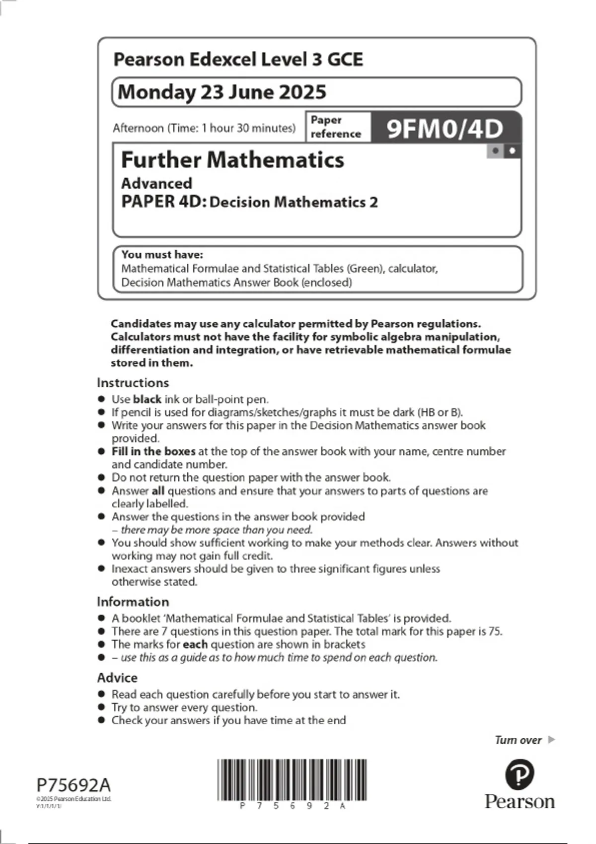 2025 Pearson Edexcel Level 3 GCE Further Mathematics Advanced PAPER 4D: Decision Mathematics 2 Combined Question Paper and Marking Scheme