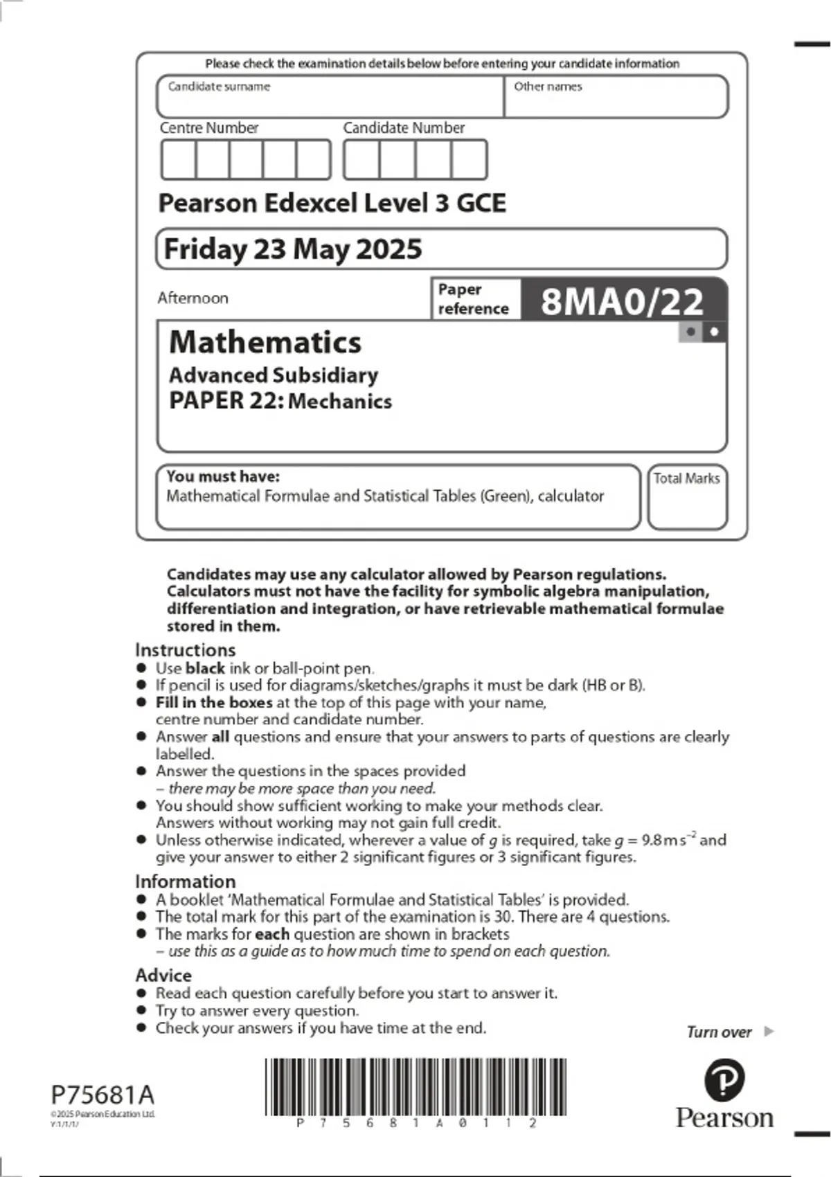 2025 Pearson Edexcel Level 3 GCE Mathematics Advanced Subsidiary PAPER 22: Mechanics Combined Question Paper and Marking Scheme