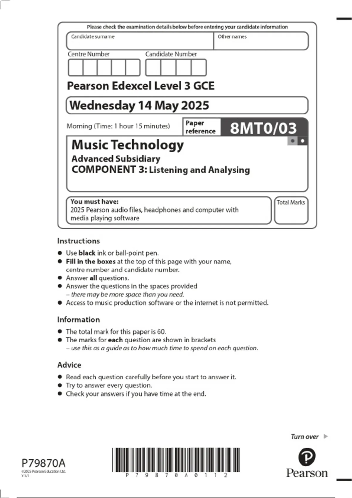 2025 Pearson Edexcel Level 3 Music Technology Advanced Subsidiary COMPONENT 3: Listening and Analysing Combined Question Paper and Marking Scheme