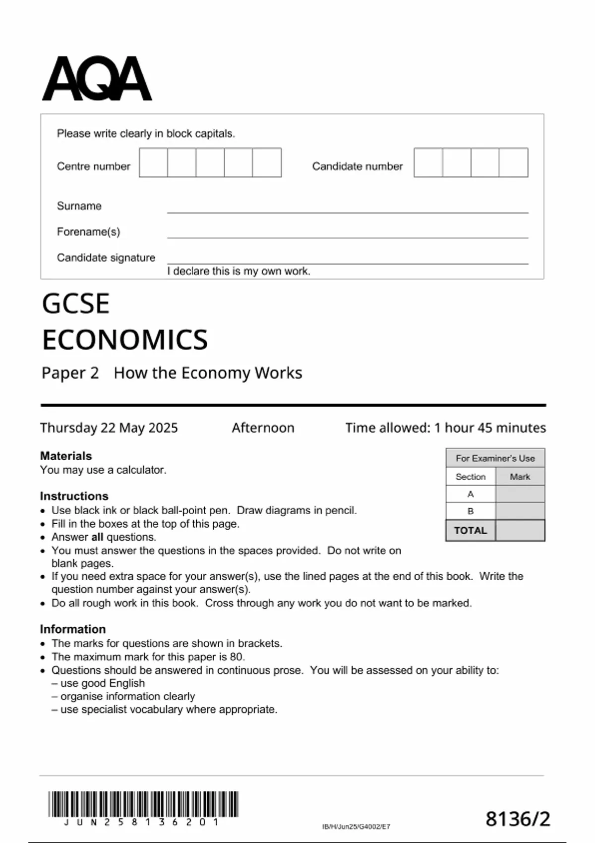 2025 AQA GCSE Economics Paper 2 (8136/2: How the Economy Works)