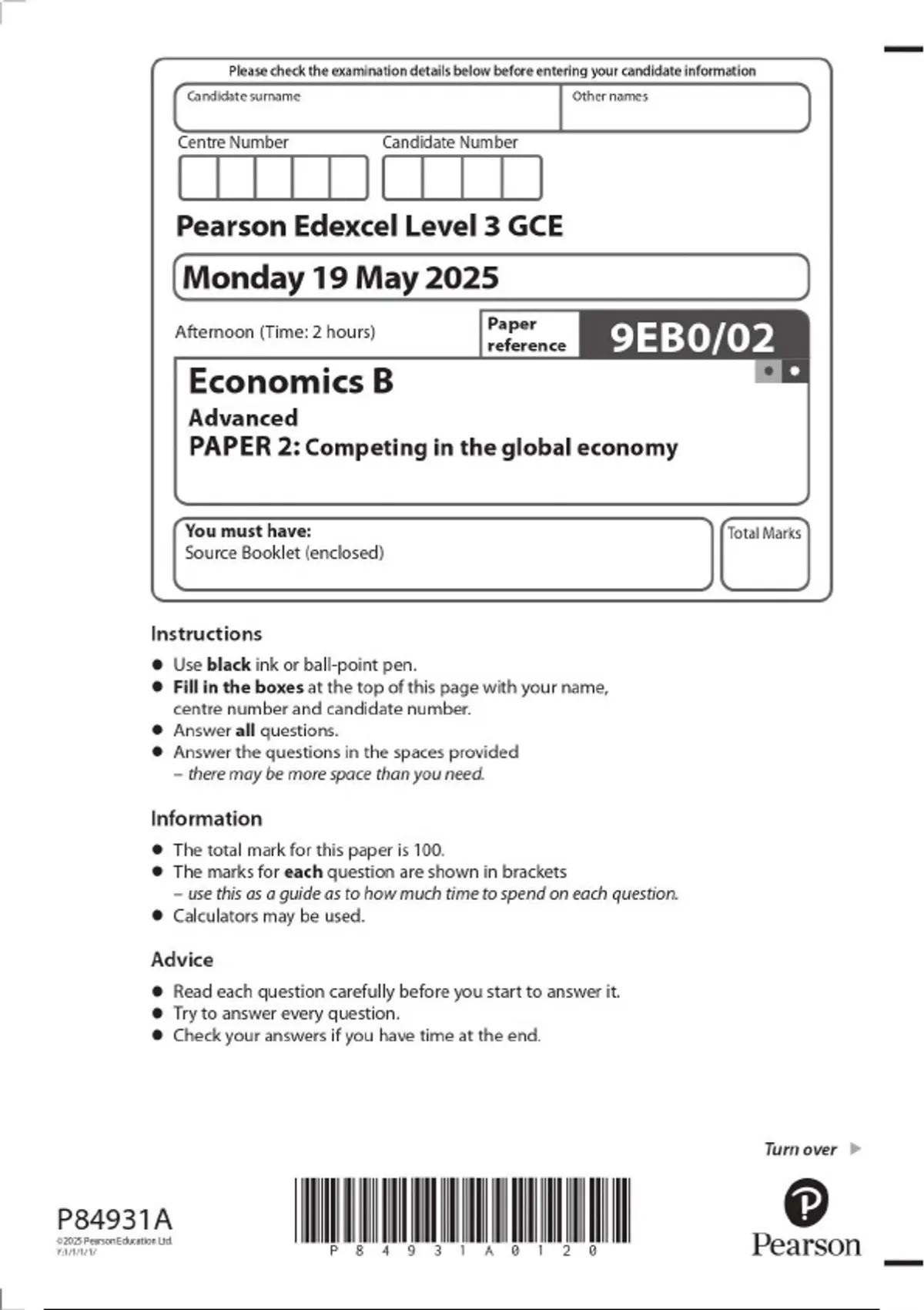 PEARSON EDEXCEL LEVEL 3 GCE MAY 2025 9EB0/02 ECONOMICS B ADVANCED PAPER 2 PAPER 2 COMPETING IN THE GLOBAL ECEONOMY