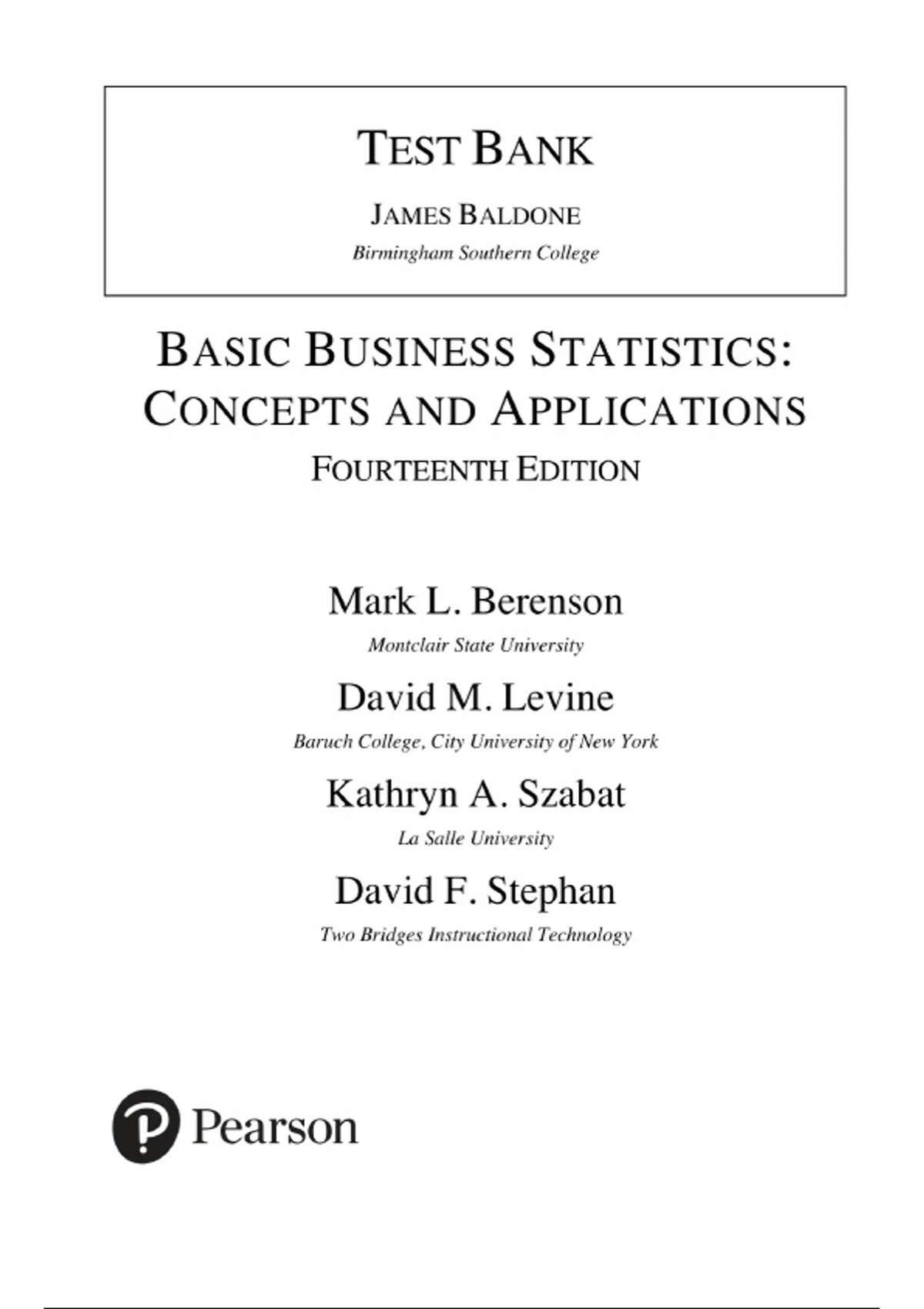 Test Bank for Basic Business Statistics: Concepts and Applications 14e 14th edition by Mark L. Berenson, David M. Levine, David F. Stephan. Full chapters test bank included Defining and Collecting Data Organizing and Visualizing Variables Numerical Descriptive Measures Basic Probability Discrete Probability Distributions The Normal Distribution and Other Continuous Distributions Sampling Distributions Confidence Interval Estimation Fundamentals of Hypothesis Testing: One-Sample Tests Two-Sample Tests Analysis of Variance Chi-Square and Nonparametric Tests Simple Linear Regression Introduction to Multiple Regression Multiple Regression Model Building Time-Series Forecasting