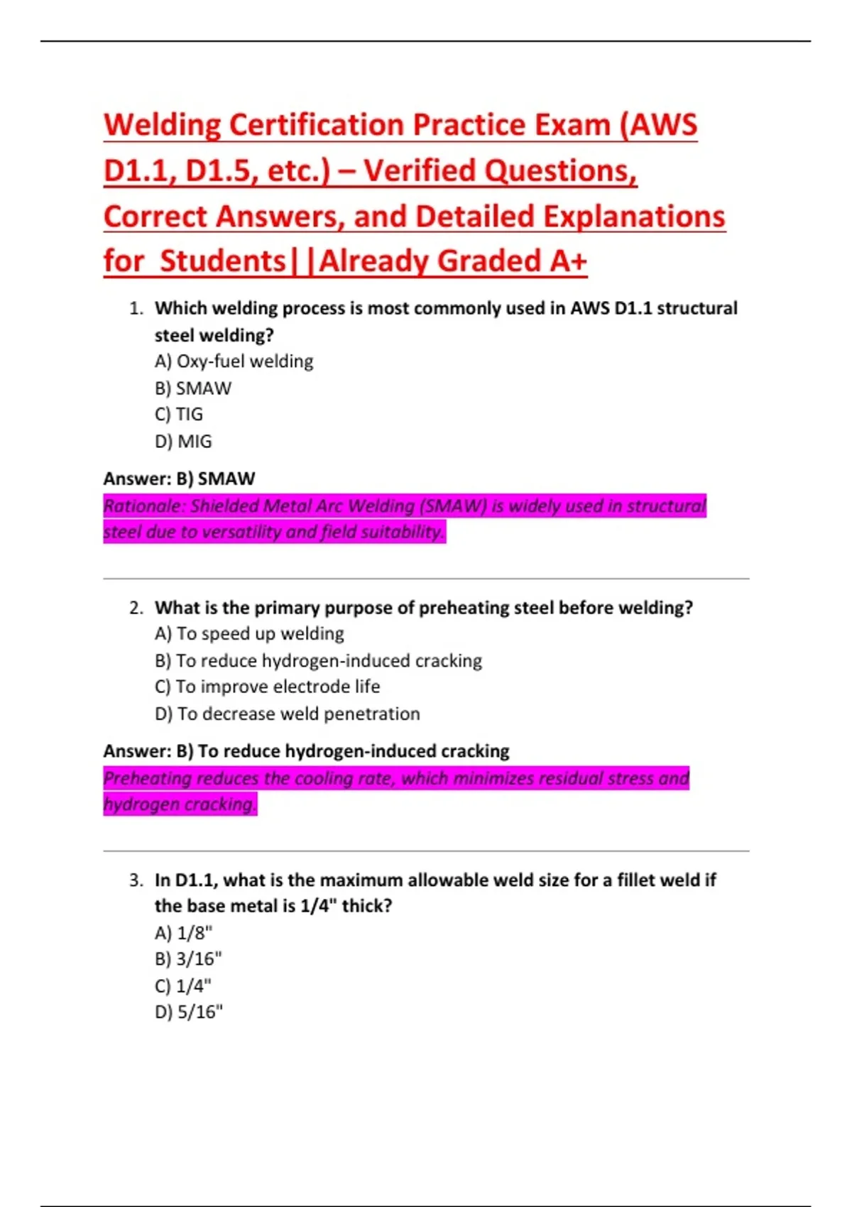 Welding Certification Practice Exam (AWS D1.1, D1.5, etc.) – Verified Questions, Correct Answers, and Detailed Explanations for Students||Already Graded A+