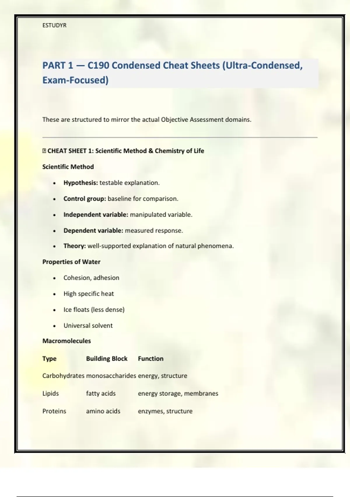 �CHEAT SHEET 1: Scientific Method & Chemistry of Life