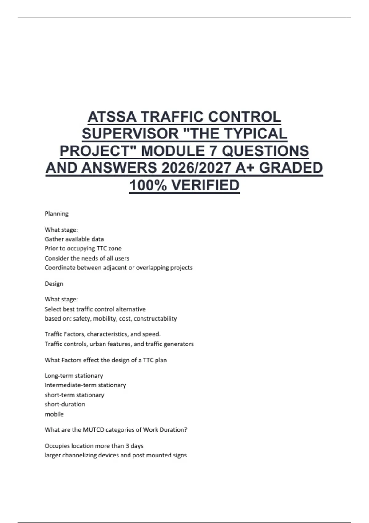 ATSSA TRAFFIC CONTROL SUPERVISOR "THE TYPICAL PROJECT" MODULE 7 QUESTIONS AND ANSWERS 2026/2027 A+ GRADED 100% VERIFIED