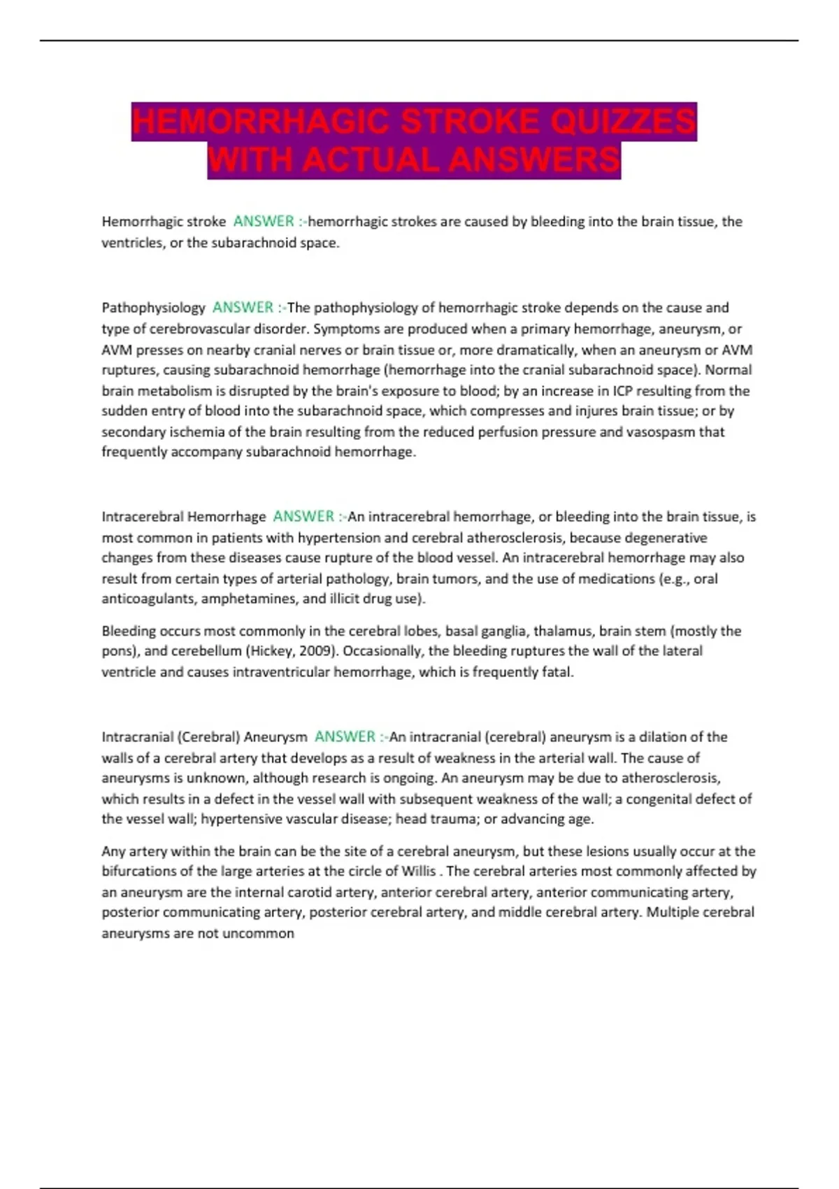 HEMORRHAGIC STROKE QUIZZES WITH ACTUAL ANSWERS