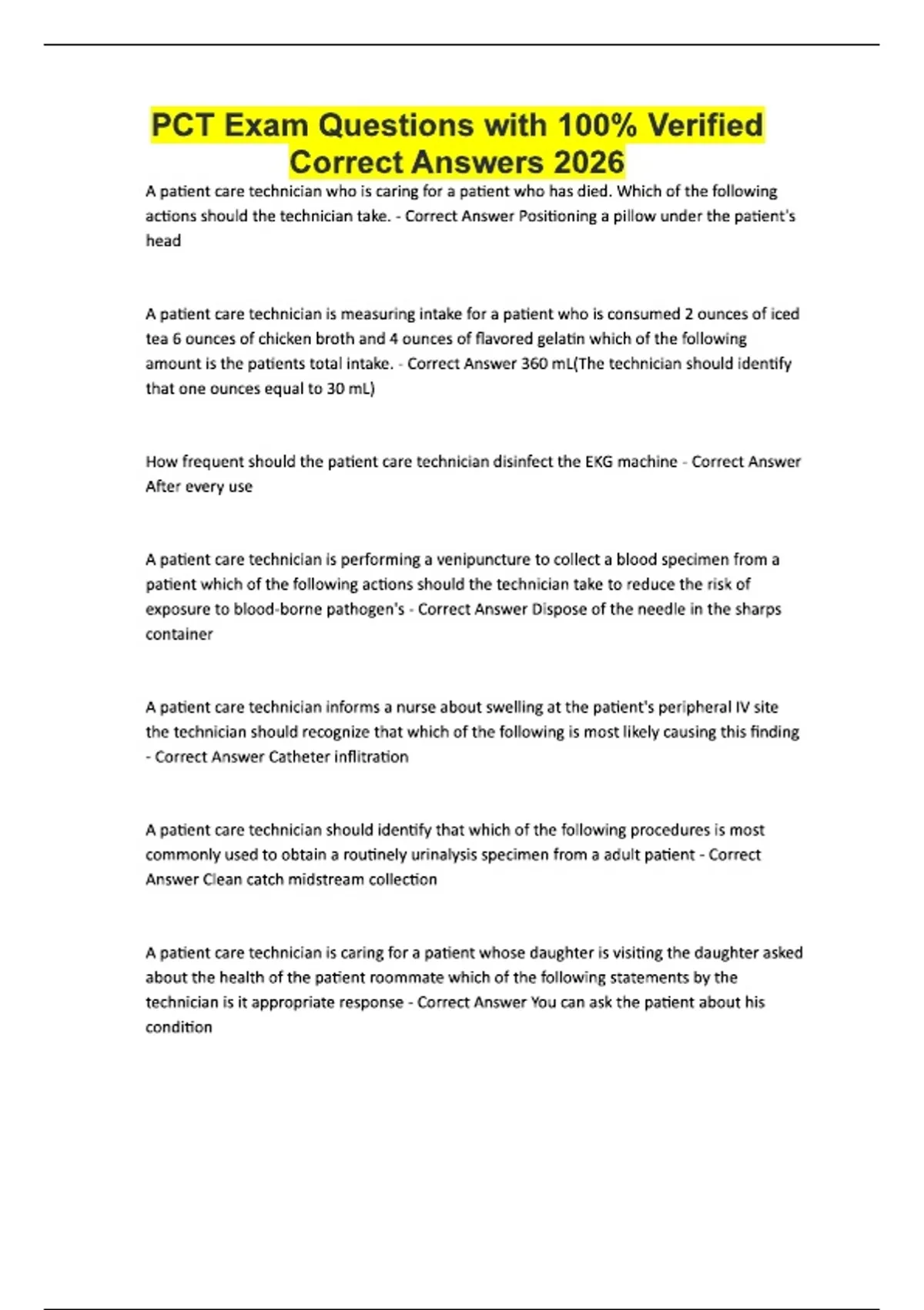 PCT Exam Questions with 100% Verified Correct Answers 2026 A patient care technician who is caring for a patient who has died. Which of the following actions should the technician take. - Correct Answer Positioning a pillow under the patient's head A patient care technician is measuring intake for a patient who is consumed 2 ounces of iced tea 6 ounces of chicken broth and 4 ounces of flavored gelatin which of the following amount is the patients total intake. - Correct Answer 360 mL(The technician should identify that one ounces equal to 30 mL) How frequent should the patient care technician disinfect the EKG machine - Correct Answer After every use A patient care technician is performing a venipuncture to collect a blood specimen from a patient which of the following actions should the technician take to reduce the risk of exposure to blood-borne pathogen's - Correct Answer Dispose of the needle in the sharps container A patient care technician informs a nurse about swelling at the patient's peripheral IV site the technician should recognize that which of the following is most likely causing this finding - Correct Answer Catheter inflitration A patient care technician should identify that which of the following procedures is most commonly used to obtain a routinely urinalysis specimen from a adult patient - Correct Answer Clean catch midstream collection A patient care technician is caring for a patient whose daughter is visiting the daughter asked about the health of the patient roommate which of the following statements by the technician is it appropriate response - Correct Answer You can ask the patient about his