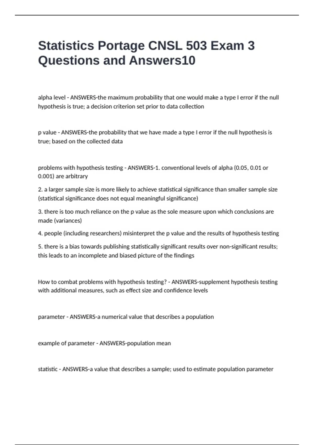 Statistics Portage CNSL 503 Exam 3 Questions and Answers alpha level - ANSWERS-the maximum probability that one would make a type I error if the null hypothesis is true; a decision criterion set prior to data collection p value - ANSWERS-the probability that we have made a type I error if the null hypothesis is true; based on the collected data problems with hypothesis testing - ANSWERS-1. conventional levels of alpha (0.05, 0.01 or 0.001) are arbitrary 2. a larger sample size is more likely to achieve statistical significance than smaller sample size (statistical significance does not equal meaningful significance) 3. there is too much reliance on the p value as the sole measure upon which conclusions are made (variances) 4. people (including researchers) misinterpret the p value and the results of hypothesis testing 5. there is a bias towards publishing statistically significant results over non-significant results; this leads to an incomplete and biased picture of the findings How to combat problems with hypothesis testing? - ANSWERS-supplement hypothesis testing with additional measures, such as effect size and confidence levels parameter - ANSWERS-a numerical value that describes a population example of parameter - ANSWERS-population mean statistic - ANSWERS-a value that describes a sample; used to estimate population parameter
