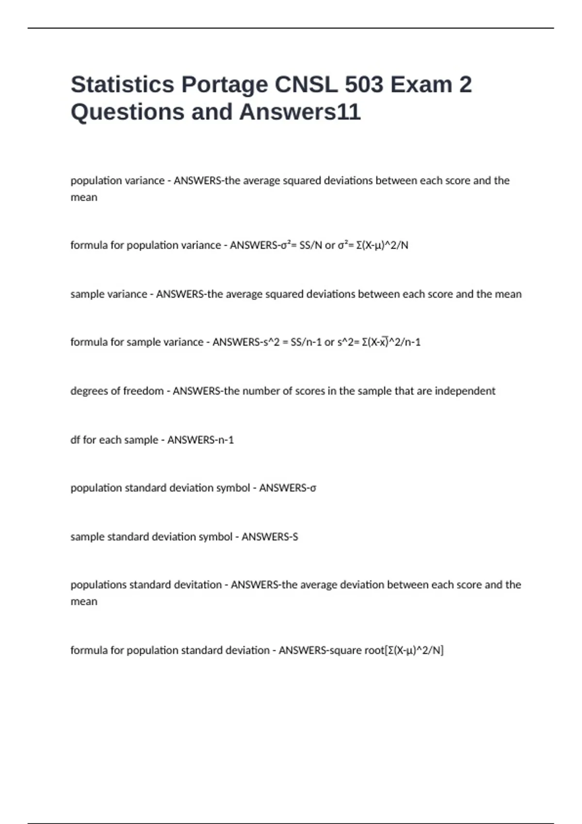 Statistics Portage CNSL 503 Exam 2 Questions and Answers population variance - ANSWERS-the average squared deviations between each score and the mean formula for population variance - ANSWERS-σ²= SS/N or σ²= Σ(X-μ)^2/N sample variance - ANSWERS-the average squared deviations between each score and the mean formula for sample variance - ANSWERS-s^2 = SS/n-1 or s^2= Σ(X-x̅)^2/n-1 degrees of freedom - ANSWERS-the number of scores in the sample that are independent df for each sample - ANSWERS-n-1 population standard deviation symbol - ANSWERS-σ sample standard deviation symbol - ANSWERS-S populations standard devitation - ANSWERS-the average deviation between each score and the mean formula for population standard deviation - ANSWERS-square root[Σ(X-μ)^2/N]
