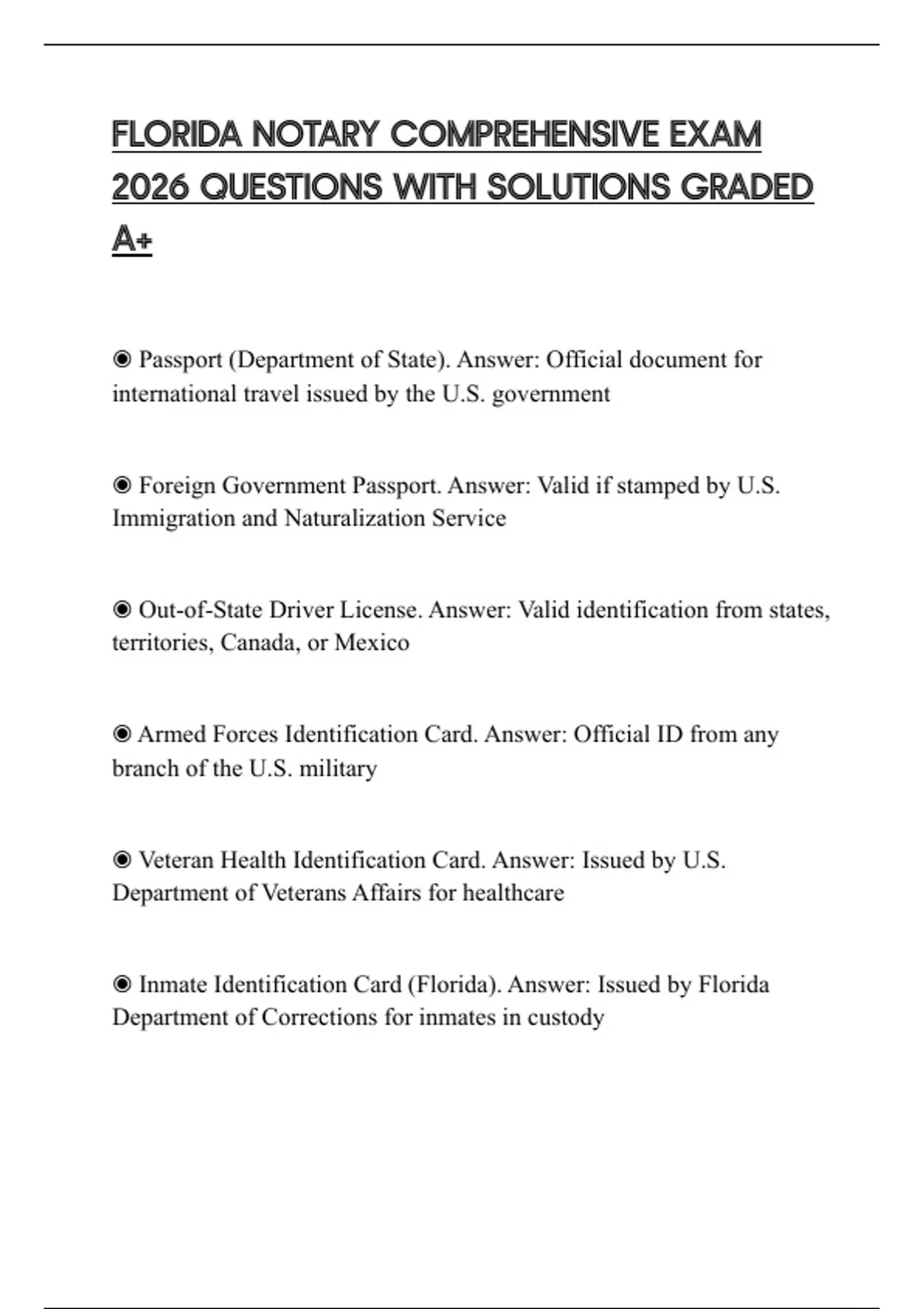 ◉ Passport (Department of State). Answer: Official document for