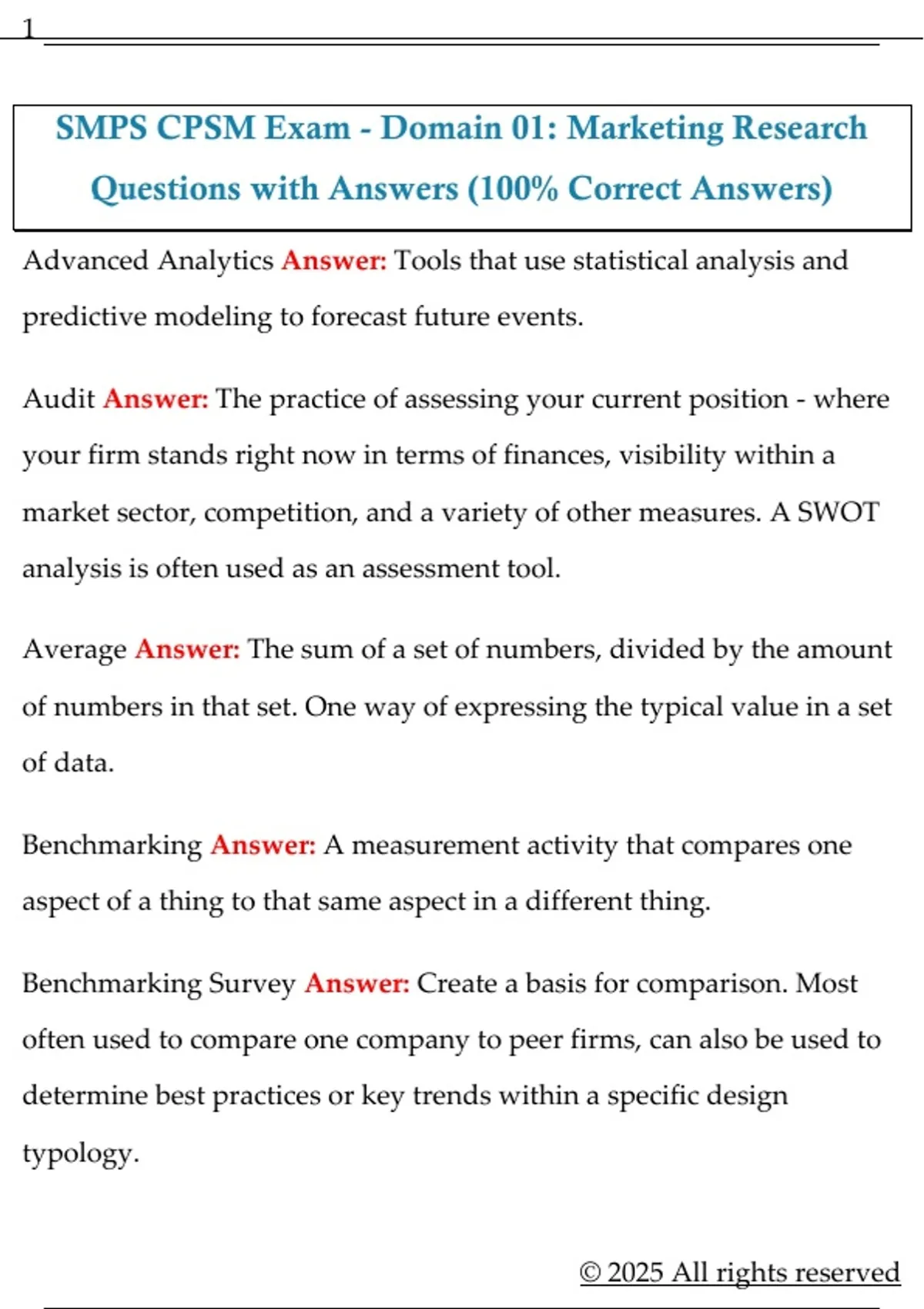 SMPS CPSM Exam - Domain 01: Marketing Research Questions with Answers (100% Correct Answers)