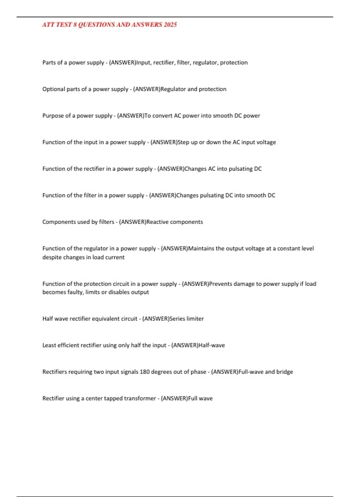 Function of the rectifier in a power supply - (ANSWER)Changes AC into pulsating DC