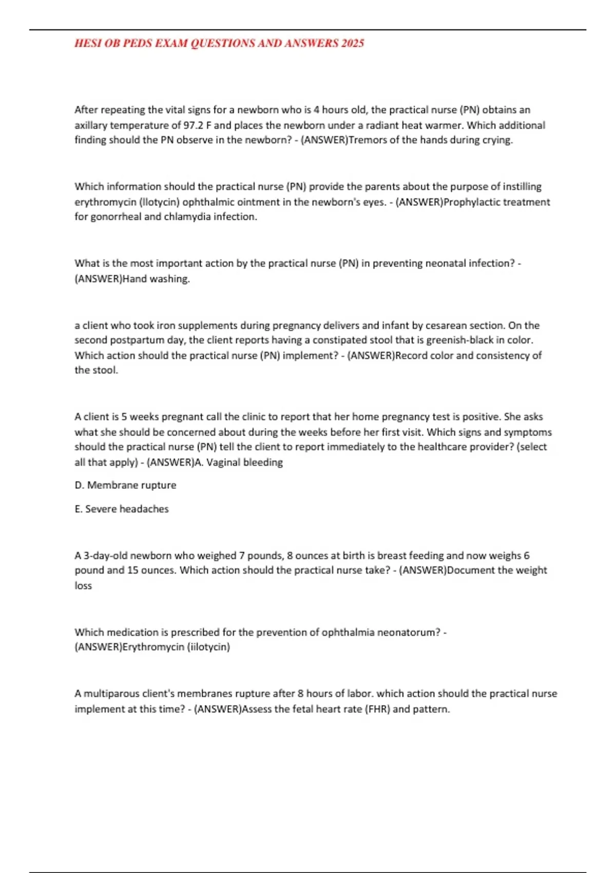 , HESI OB PEDS EXAM QUESTIONS AND ANSWERS 2025