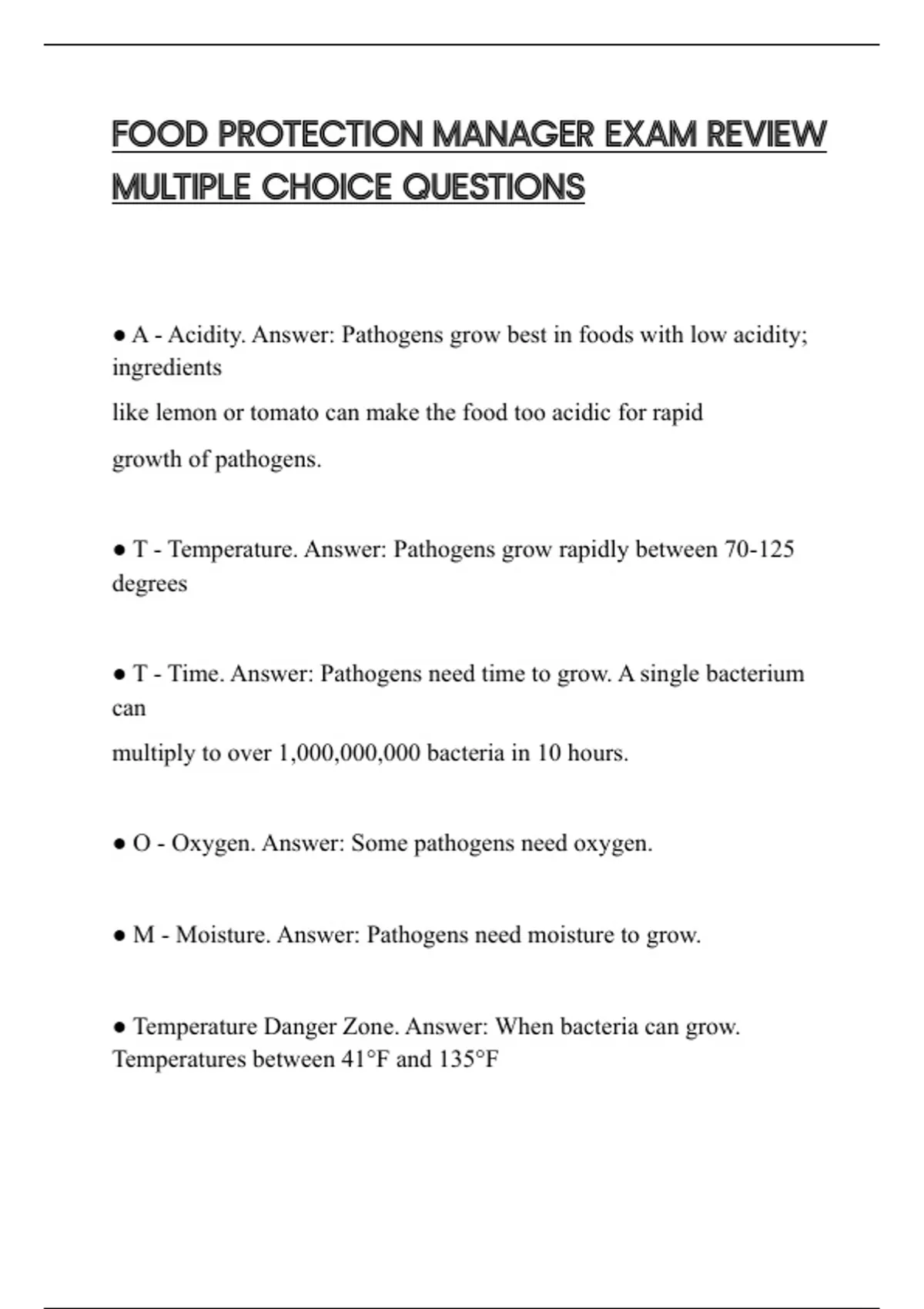 ● A - Acidity. Answer: Pathogens grow best in foods with low acidity;