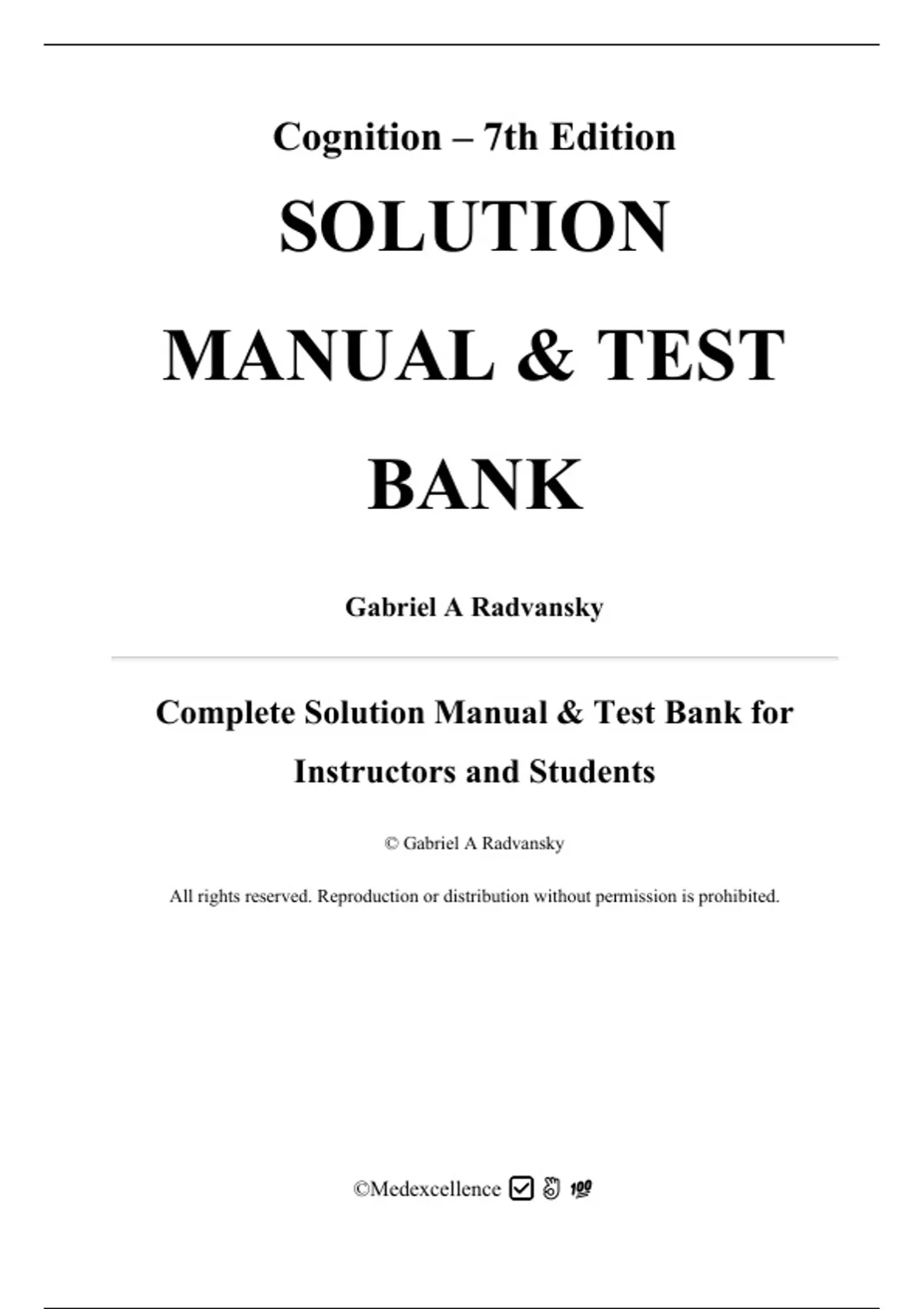Solutions Manual & Test Bank for Cognition 7th Edition by Gabriel A Radvansky, (All Chapters 1-15). Full Chapters Include;...Cognitive Psychology Cognitive Neuroscience Sensation and Perception Attention Short-Term Working Memory Learning and Remembering Knowing Memory and Forgetting Language Comprehension Reasoning and Decision Making Problem Solving Emotion Cognitive Development in Infants and Children Cognitive Aging