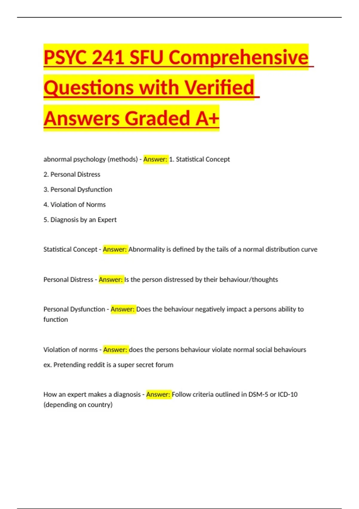 PSYC 241 SFU Comprehensive Questions with Verified Answers Graded A+