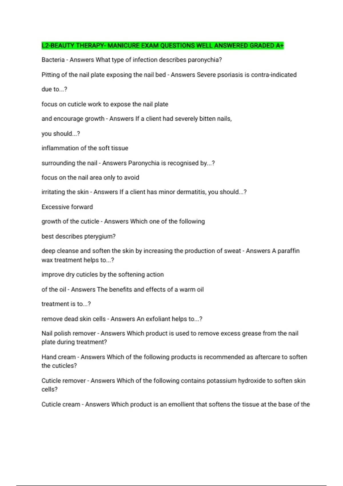 L2-BEAUTY THERAPY- MANICURE EXAM QUESTIONS WELL ANSWERED GRADED A+ Bacteria - Answers What type of infection describes paronychia? Pitting of the nail plate exposing the nail bed - Answers Severe psoriasis is contra-indicated due to...? focus on cuticle work to expose the nail plate and encourage growth - Answers If a client had severely bitten nails, you should...? inflammation of the soft tissue surrounding the nail - Answers Paronychia is recognised by...? focus on the nail area only to avoid irritating the skin - Answers If a client has minor dermatitis, you should...? Excessive forward growth of the cuticle - Answers Which one of the following best describes pterygium? deep cleanse and soften the skin by increasing the production of sweat - Answers A paraffin wax treatment helps to...? improve dry cuticles by the softening action of the oil - Answers The benefits and effects of a warm oil treatment is to...? remove dead skin cells - Answers An exfoliant helps to...? Nail polish remover - Answers Which product is used to remove excess grease from the nail plate during treatment? Hand cream - Answers Which of the following products is recommended as aftercare to soften the cuticles? Cuticle remover - Answers Which of the following contains potassium hydroxide to soften skin cells? Cuticle cream - Answers Which product is an emollient that softens the tissue at the base of the nail?