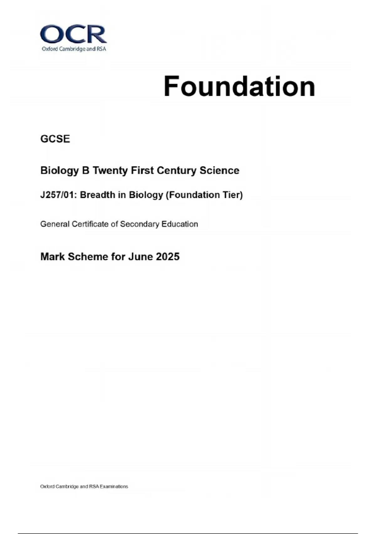 J257/01 Breadth in Biology Foundation Tier | GCSE Paper 1 Revision 2025 MARK SCHEME