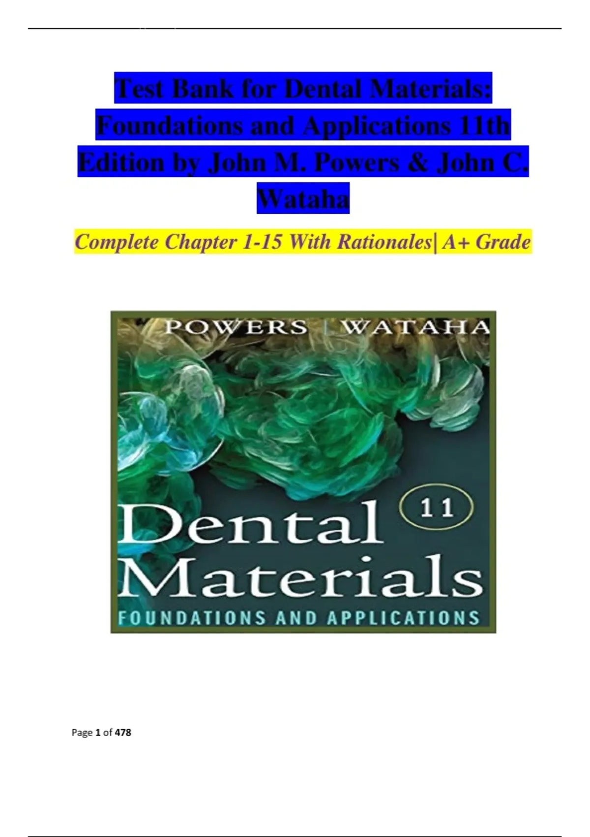 Test Bank for Dental Materials; Foundations and Applications, 11th Edition (Mosby, 2016) by Powers and Wataha, Isbn no; 9780323316378, (Chapters 1-15) Complete Study Guide!!!!!