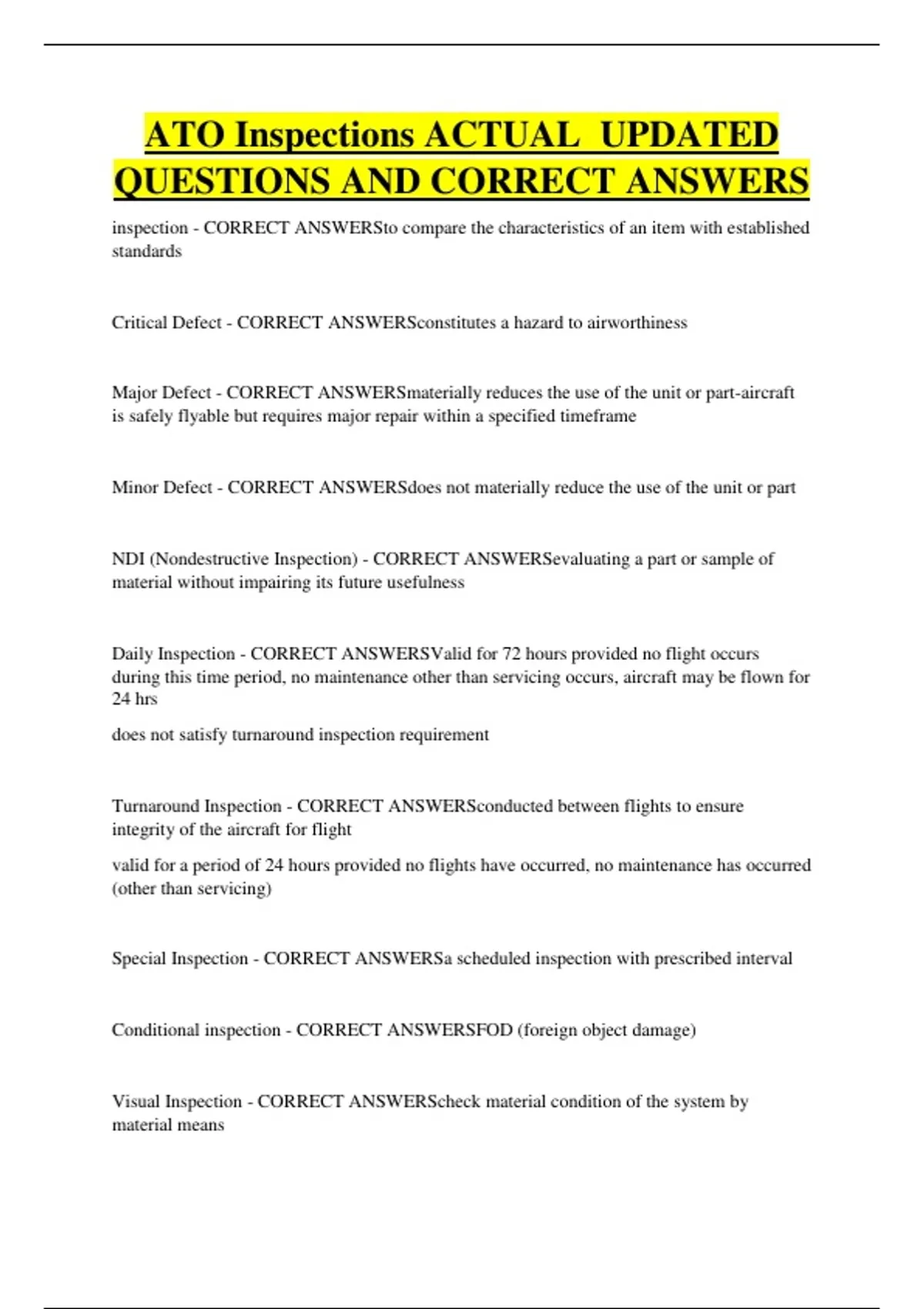 ATO Inspections ACTUAL UPDATED QUESTIONS AND CORRECT ANSWERS inspection - CORRECT ANSWERSto compare the characteristics of an item with established standards Critical Defect - CORRECT ANSWERSconstitutes a hazard to airworthiness Major Defect - CORRECT ANSWERSmaterially reduces the use of the unit or part-aircraft is safely flyable but requires major repair within a specified timeframe Minor Defect - CORRECT ANSWERSdoes not materially reduce the use of the unit or part NDI (Nondestructive Inspection) - CORRECT ANSWERSevaluating a part or sample of material without impairing its future usefulness Daily Inspection - CORRECT ANSWERSValid for 72 hours provided no flight occurs during this time period, no maintenance other than servicing occurs, aircraft may be flown for 24 hrs does not satisfy turnaround inspection requirement Turnaround Inspection - CORRECT ANSWERSconducted between flights to ensure integrity of the aircraft for flight valid for a period of 24 hours provided no flights have occurred, no maintenance has occurred (other than servicing) Special Inspection - CORRECT ANSWERSa scheduled inspection with prescribed interval Conditional inspection - CORRECT ANSWERSFOD (foreign object damage) Visual Inspection - CORRECT ANSWERScheck material condition of the system by material means OP CHECKS - CORRECT ANSWERSused by organizational maintenance technicians to check the operational status of the aircraft and its systems 4 types of op checks - CORRECT ANSWERSprior to flight, following a flight, prior to troubleshooting, following o-level maintenance action Primary reference for Naval maintance Manuals - CORRECT ANSWERSNAVAIR-00-25 100 maintenance instruction manual... - CORRECT ANSWERStells you how to do maintenance wiring manuals contain - CORRECT ANSWERSwiring data diagrams, wirings lists,