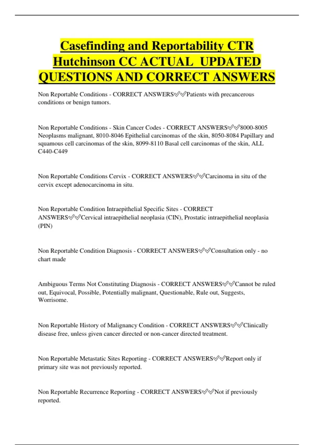 Casefinding and Reportability CTR Hutchinson CC ACTUAL UPDATED QUESTIONS AND CORRECT ANSWERS Non Reportable Conditions - CORRECT ANSWERSPatients with precancerous conditions or benign tumors. Non Reportable Conditions - Skin Cancer Codes - CORRECT ANSWERS Neoplasms malignant, Epithelial carcinomas of the skin, Papillary and squamous cell carcinomas of the skin, Basal cell carcinomas of the skin, ALL C440-C449 Non Reportable Conditions Cervix - CORRECT ANSWERSCarcinoma in situ of the cervix except adenocarcinoma in situ. Non Reportable Condition Intraepithelial Specific Sites - CORRECT ANSWERSCervical intraepithelial neoplasia (CIN), Prostatic intraepithelial neoplasia (PIN) Non Reportable Condition Diagnosis - CORRECT ANSWERSConsultation only - no chart made Ambiguous Terms Not Constituting Diagnosis - CORRECT ANSWERSCannot be ruled out, Equivocal, Possible, Potentially malignant, Questionable, Rule out, Suggests, Worrisome. Non Reportable History of Malignancy Condition - CORRECT ANSWERSClinically disease free, unless given cancer directed or non-cancer directed treatment. Non Reportable Metastatic Sites Reporting - CORRECT ANSWERSReport only if primary site was not previously reported. Non Reportable Recurrence Reporting - CORRECT ANSWERSNot if previously reported. Establishment of Reportable List and Data Set - CORRECT ANSWERSCancer committee decides and sets policy for patient follow-up. Where is the Reportable List Posted? - CORRECT ANSWERSThe registry's policy and procedures. Are Registries participating in the Approvals Program of the CoC of the ACoS required to use the Reportable List defined by the CoC? - CORRECT ANSWERSTrue What are the 2 Types of Casefinding? - CORRECT ANSWERSActive and passive Who does Active Casefinding Involve and Why? - CORRECT ANSWERSRegistry personnel for more thorough and accurate identification. Who does Passive Casefinding Involve and Why is it less thorough than