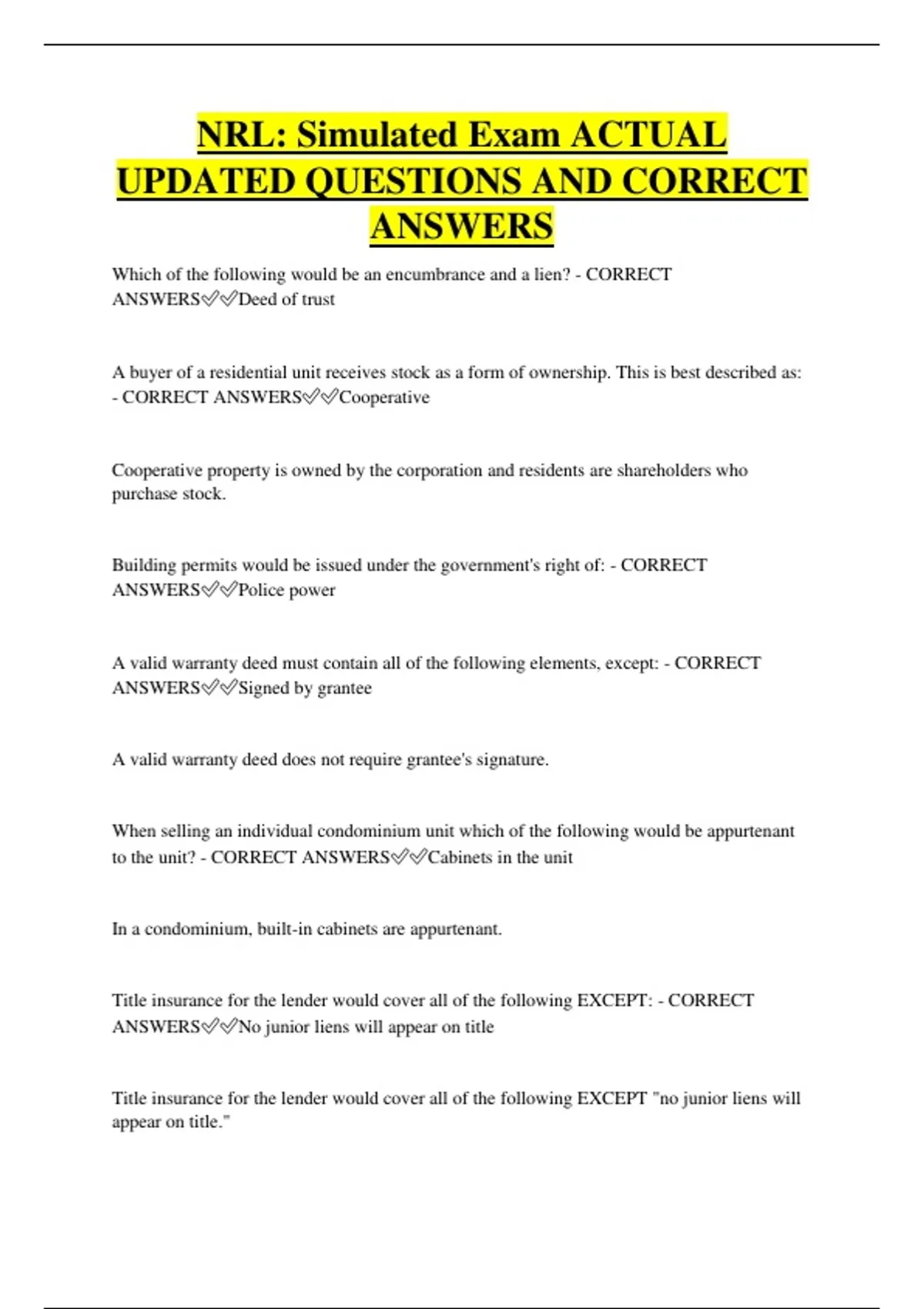 NRL: Simulated Exam ACTUAL UPDATED QUESTIONS AND CORRECT ANSWERS Which of the following would be an encumbrance and a lien? - CORRECT ANSWERSDeed of trust A buyer of a residential unit receives stock as a form of ownership. This is best described as: - CORRECT ANSWERSCooperative Cooperative property is owned by the corporation and residents are shareholders who purchase stock. Building permits would be issued under the government's right of: - CORRECT ANSWERSPolice power A valid warranty deed must contain all of the following elements, except: - CORRECT ANSWERSSigned by grantee A valid warranty deed does not require grantee's signature. When selling an individual condominium unit which of the following would be appurtenant to the unit? - CORRECT ANSWERSCabinets in the unit In a condominium, built-in cabinets are appurtenant. Title insurance for the lender would cover all of the following EXCEPT: - CORRECT ANSWERSNo junior liens will appear on title Title insurance for the lender would cover all of the following EXCEPT "no junior liens will appear on title." Husband & wife own community property and make a will. How is the property distributed upon the death of one party? - CORRECT ANSWERSProperty passes according to the will What would not be a legal principle when applying legal tests to fixtures? - CORRECT ANSWERSCost of the item What power does the government exercise when it takes private property for public use? - CORRECT ANSWERSEminent domain Condemnation, or appropriation, describe the act of taking the land. Eminent domain is the power that makes it possible. All of the following are examples of real property except: - CORRECT ANSWERSDrapes Drapes are usually not considered real property. In some instances (i.e. drapes custom made to fit an unusual window), they can be considered real property. Which of the following does not derive from a city's police power? - CORRECT ANSWERSDeveloper's restrictive covenants All are government restrictions on land use except C, which is enacted by a private citizen. Roberta wishes to build her garage 2 feet from her side lot line. City code calls for all side setbacks to be at least 5 feet. She will need to get what to be able to legally proceed and be assured that future owners will not have a problem? - CORRECT ANSWERSA variance The Smiths purchase a cooperative on the Gold Coast. What will they receive at closing? - CORRECT ANSWERSShares of stock and a proprietary lease A cooperative is not real estate, but the purchase of shares of stock in a c