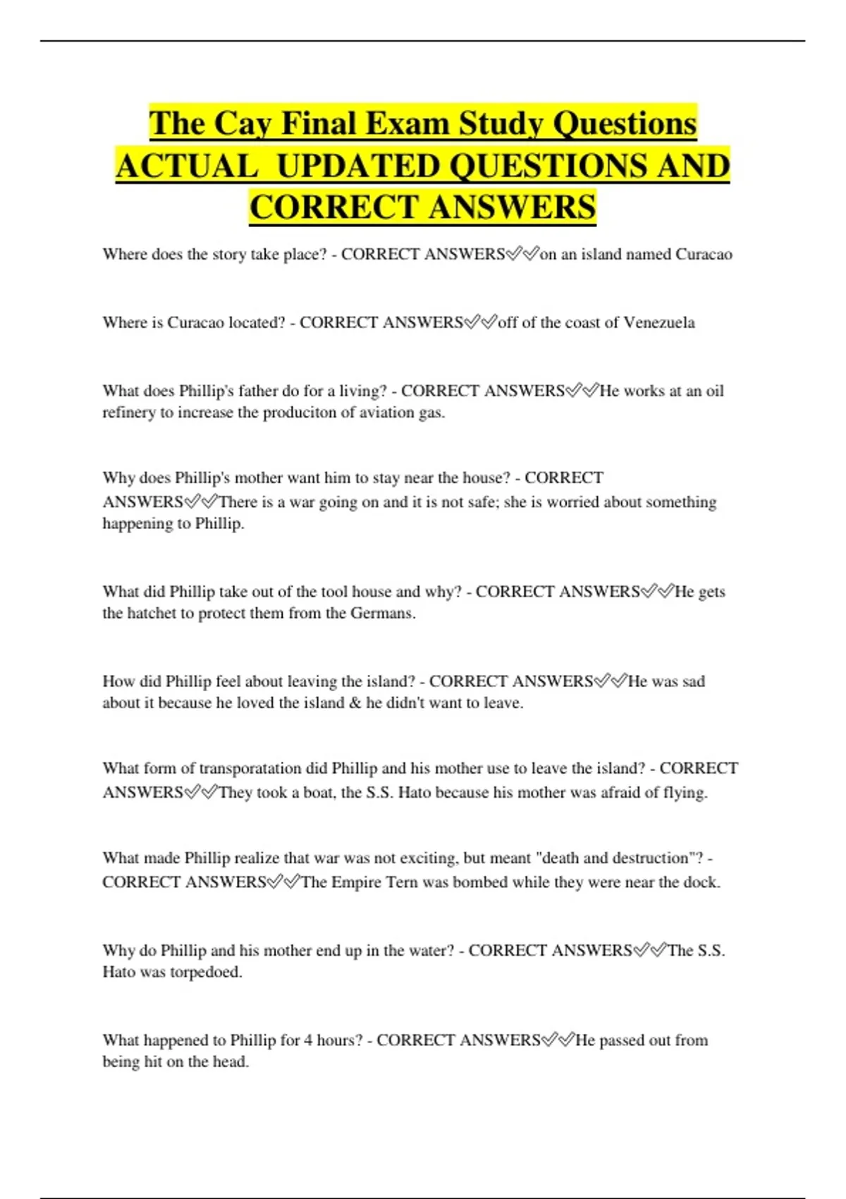 The Cay Final Exam Study Questions ACTUAL UPDATED QUESTIONS AND CORRECT ANSWERS Where does the story take place? - CORRECT ANSWERSon an island named Curacao Where is Curacao located? - CORRECT ANSWERSoff of the coast of Venezuela What does Phillip's father do for a living? - CORRECT ANSWERSHe works at an oil refinery to increase the produciton of aviation gas. Why does Phillip's mother want him to stay near the house? - CORRECT ANSWERSThere is a war going on and it is not safe; she is worried about something happening to Phillip. What did Phillip take out of the tool house and why? - CORRECT ANSWERSHe gets the hatchet to protect them from the Germans. How did Phillip feel about leaving the island? - CORRECT ANSWERSHe was sad about it because he loved the island & he didn't want to leave. What form of transporatation did Phillip and his mother use to leave the island? - CORRECT ANSWERSThey took a boat, the S.S. Hato because his mother was afraid of flying. What made Phillip realize that war was not exciting, but meant "death and destruction"? - CORRECT ANSWERSThe Empire Tern was bombed while they were near the dock. Why do Phillip and his mother end up in the water? - CORRECT ANSWERSThe S.S. Hato was torpedoed. What happened to Phillip for 4 hours? - CORRECT ANSWERSHe passed out from being hit on the head. How did Phillip first describe Timothy? - CORRECT ANSWERSPhillip thought that Timothy was ugly, had a flat nose, a broad face and a mass of gray hair.