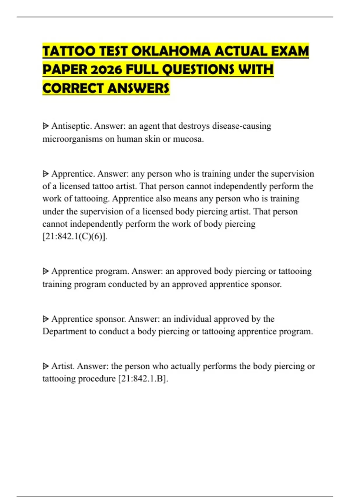 TATTOO TEST OKLAHOMA ACTUAL EXAM PAPER 2026 FULL QUESTIONS WITH CORRECT ANSWERS