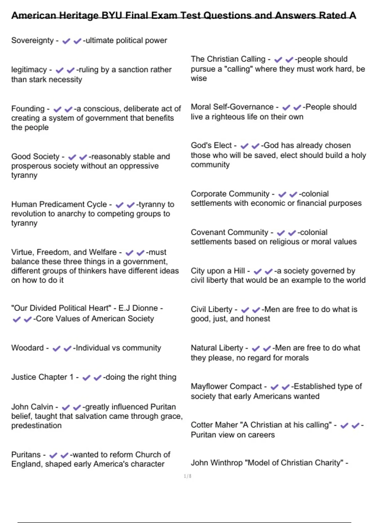 American Heritage BYU Final Exam Test Questions and Answers Rated A
