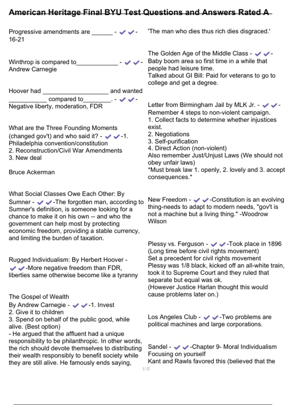 , American Heritage Final BYU Test Questions and Answers Rated A