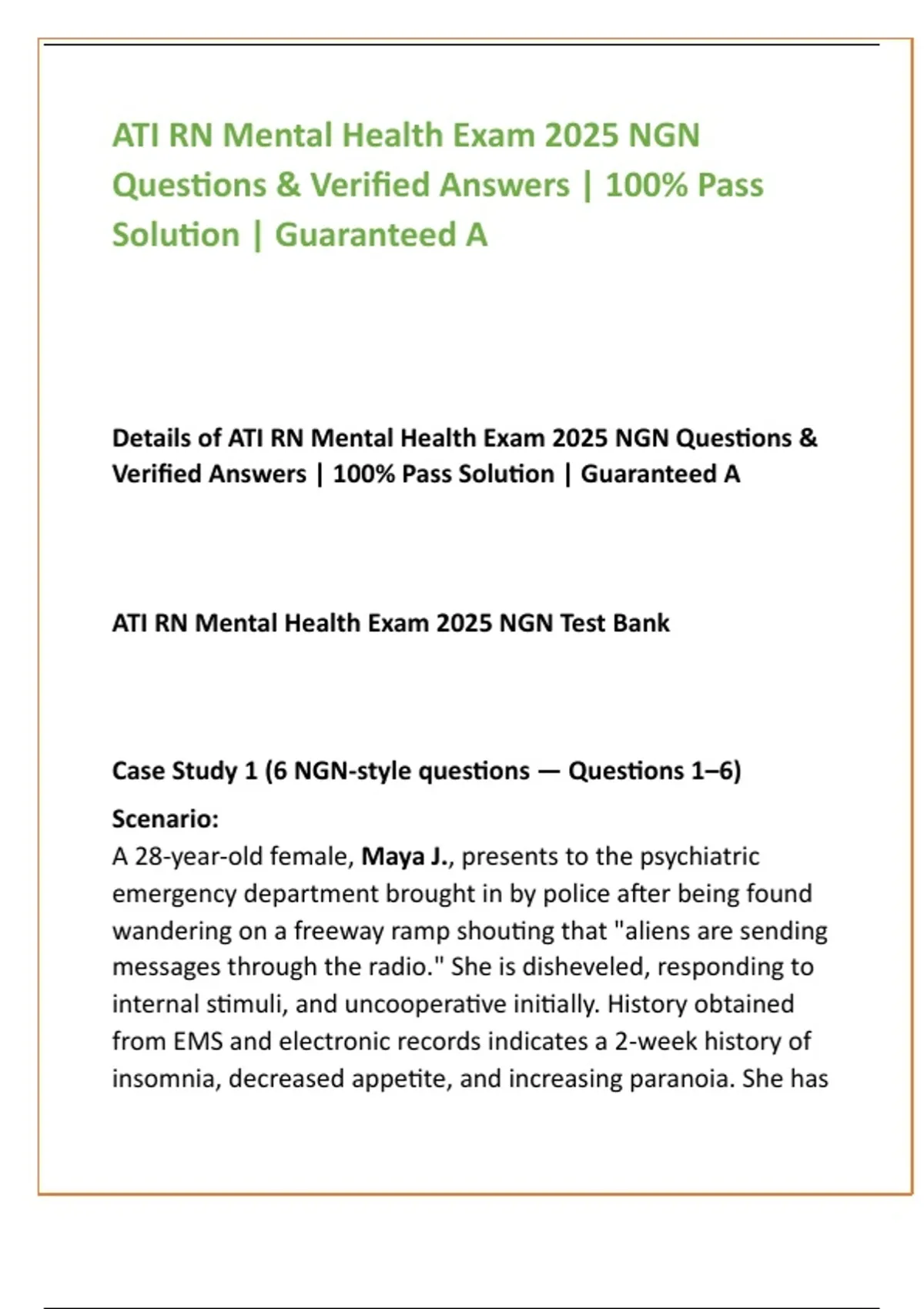 ATI RN Mental Health Exam 2025 NGN Test Bank | Verified Answers & Rationales | 100% Pass | Mental Health Nursing ATI Practice Questions 2) SEO Product Description (200–300 words) Master the ATI RN Mental Health Exam 2025 with this elite, exam-aligned Next-Generation NCLEX (NGN) Mental Health Test Bank, designed to help nursing students achieve Guaranteed A-level performance. Built by clinical educators and ATI-focused nursing specialists, this digital resource delivers complete coverage of all 2025 ATI Mental Health domains, bringing you the exact depth, structure, and cognitive patterns used on ATI proctored assessments. This high-precision test bank features NGN item types, including MCQs, SATA, case studies, bowtie items, trend scenarios, and clinical judgment sequences—mirroring the ATI exam blueprint to maximize real-score improvement. Students report 90–100% score jumps after using this resource consistently due to its focus on clinical reasoning, psychiatric safety, therapeutic communication, crisis response, and prioritization skills. Perfect for ATI course exams, the ATI proctored Mental Health Exam, NGN prep, mental health nursing modules, and clinical rotation readiness. Each question includes verified correct answers with evidence-based rationales, helping you understand exactly why each option is right or wrong. Features 100% alignment with ATI RN Mental Health Exam 2025 Full NGN coverage: MCQ, SATA, case studies, bowtie, trend, and clinical judgment formats Verified answers with clear, evidence-based rationales Covers all major psychiatric categories, psychopharmacology, safety, communication, crisis care & mental status assessment Built for high-speed score improvement and exam readiness Instant digital download—no waiting, no time limits Become fully confident, clinically sharp, and ATI-ready with the #1 mental health NGN test bank trusted by nursing students worldwide. 3) 8 High-Value SEO Keywords ATI Mental Health NGN test bank ATI RN Mental Health Exam 2025 Mental health nursing ATI practice questions RN mental health verified answers ATI NGN case studies and bowtie items ATI mental health proctored exam prep Psychiatric nursing NGN questions ATI mental health study guide 2025 4) 10 Hashtags #ATIMentalHealth #ATITestBank #NGNQuestions #NursingSchoolSuccess #MentalHealthNursing #ATIProctoredExam #NurseStudentResources #NursingExamPrep #NCLEXNGN #PsychNursingMastery