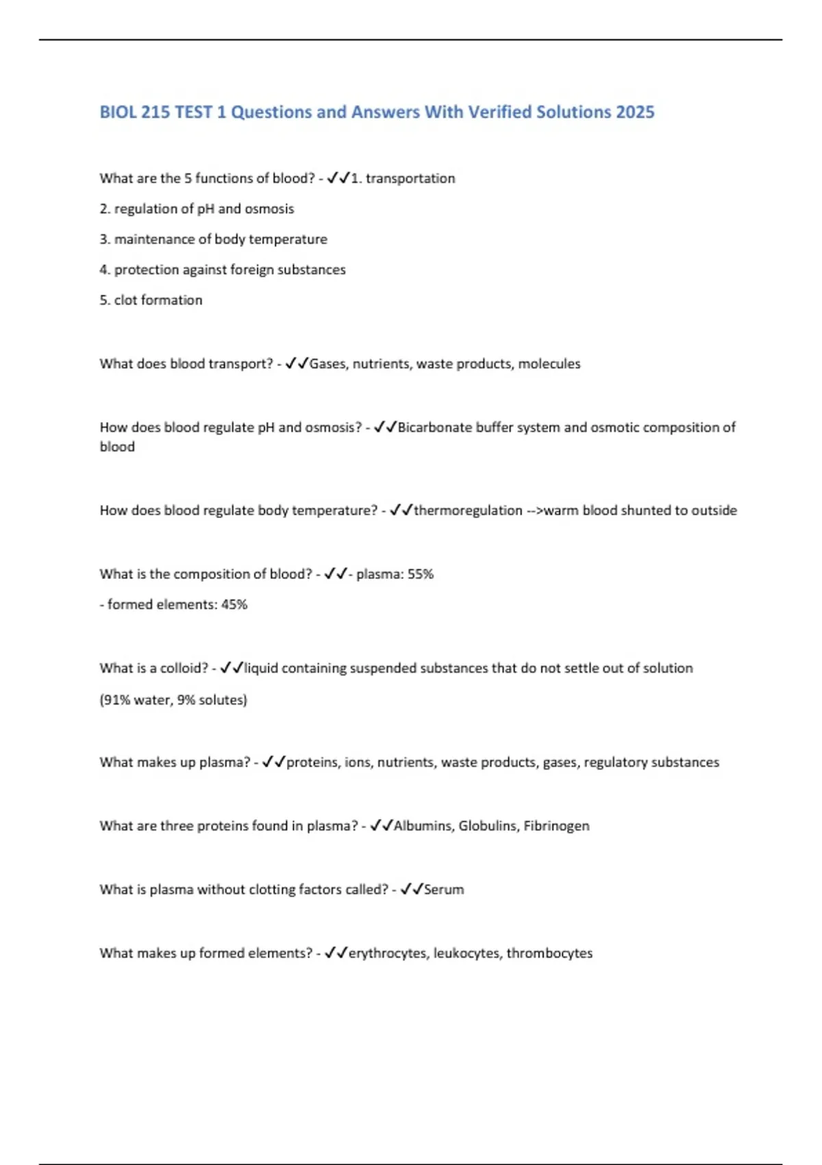 BIOL 215 TEST 1 Questions and Answers With Verified Solutions 2025